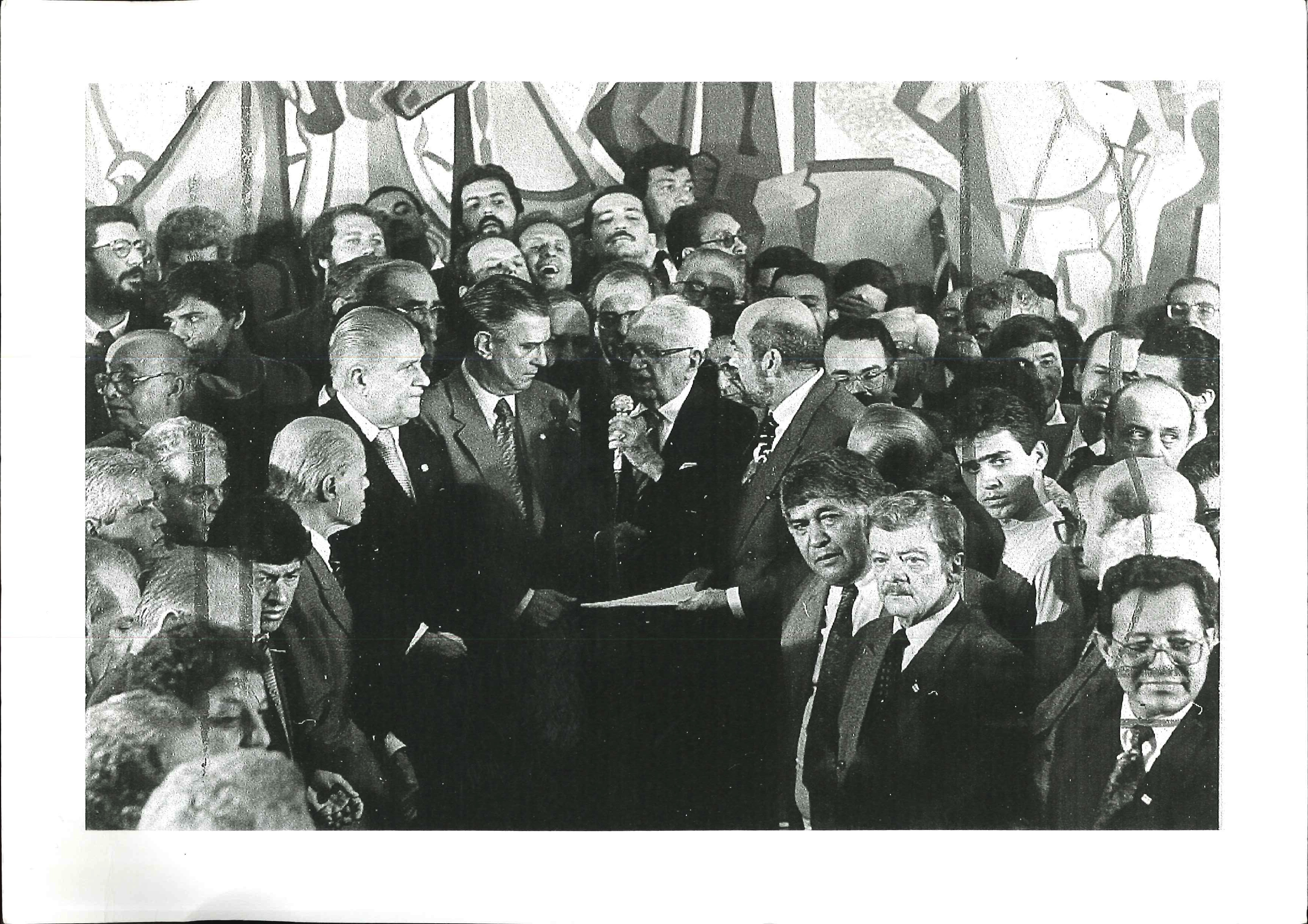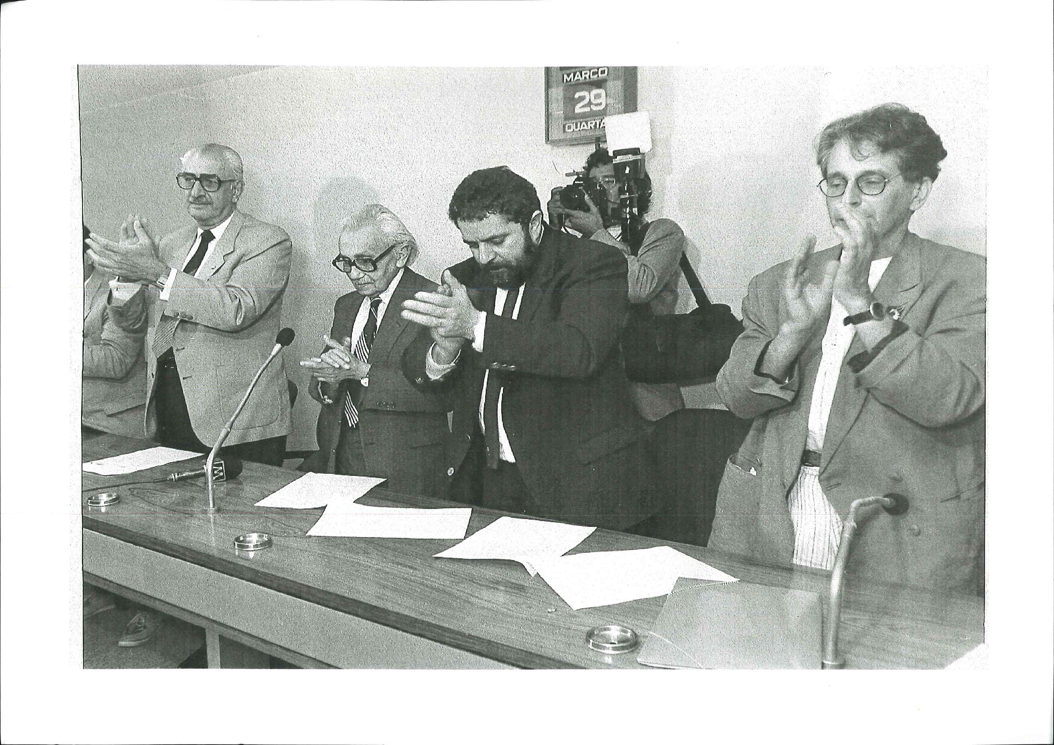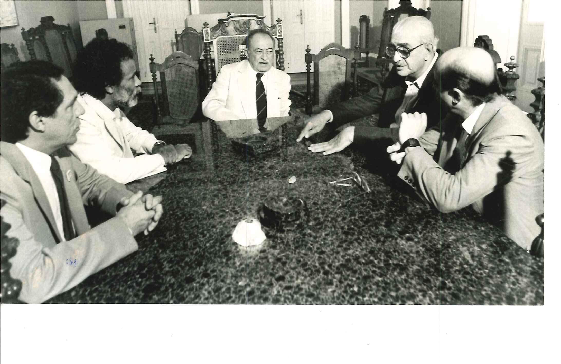 "Gov. Miguel Arraes recebe em seu gabinete, no Palácio Campo das Princesas, em Recife em fevereiro de 1990, membros da Executiva Nacional do PSB que lhe formulam convite para ingressar no partido. Na foto, da esquerda para a direita, Roberto Amaral, Jamil Haddad, Miguel Arraes e Walteir."