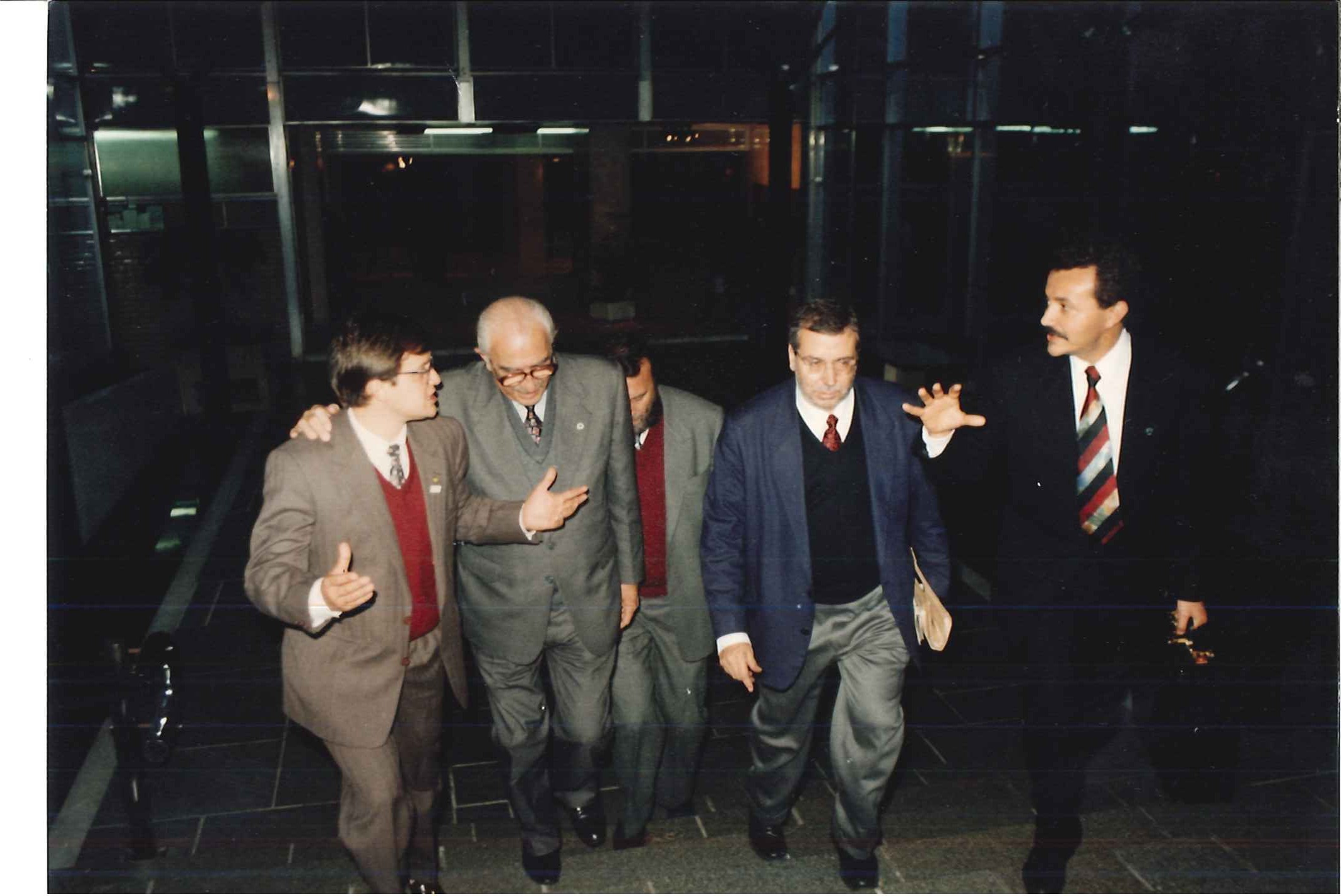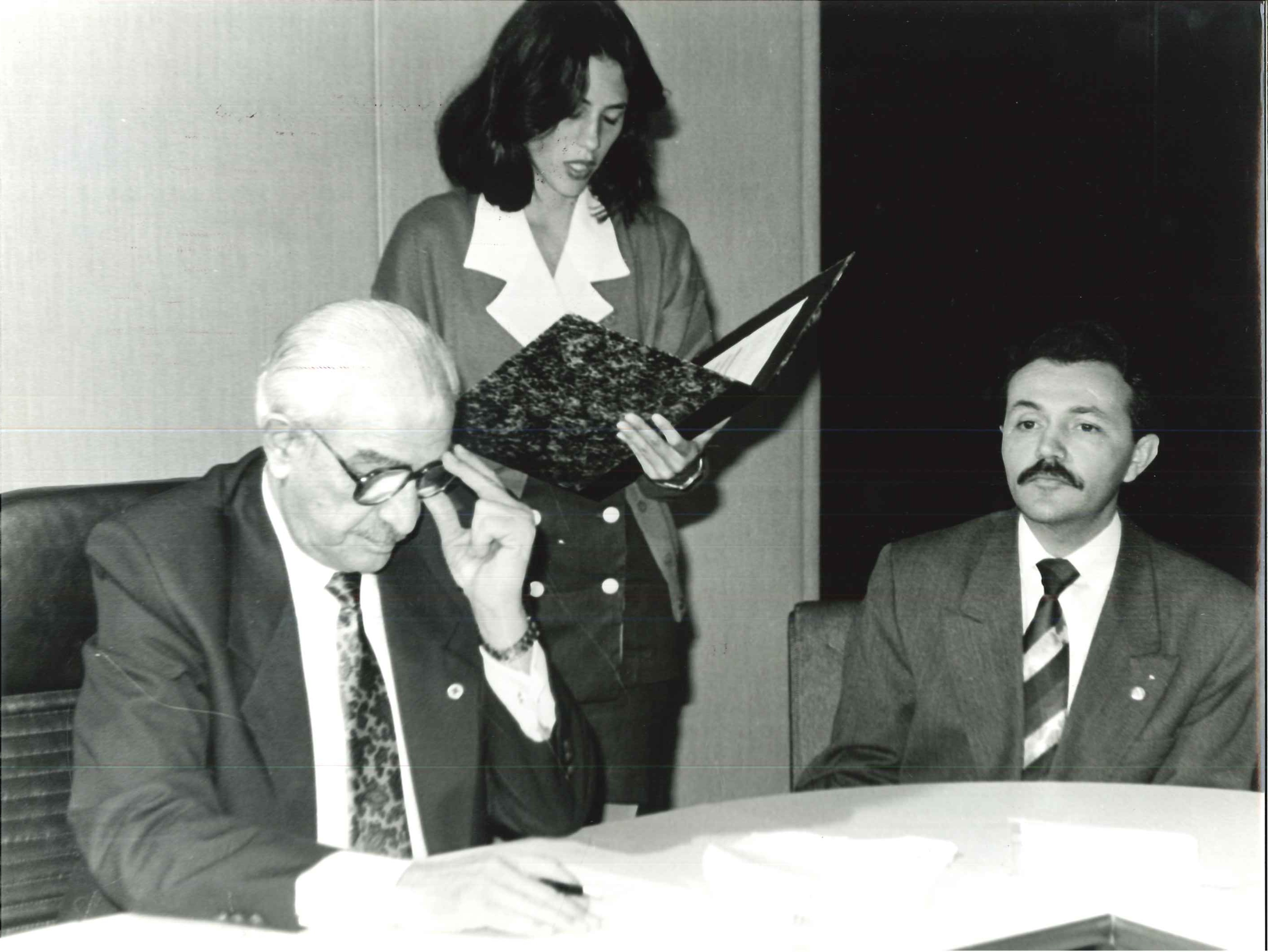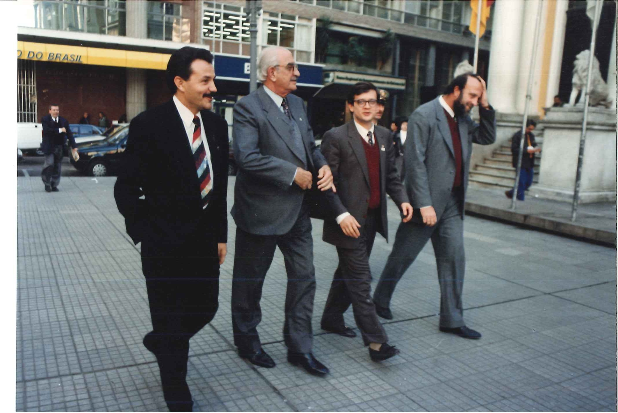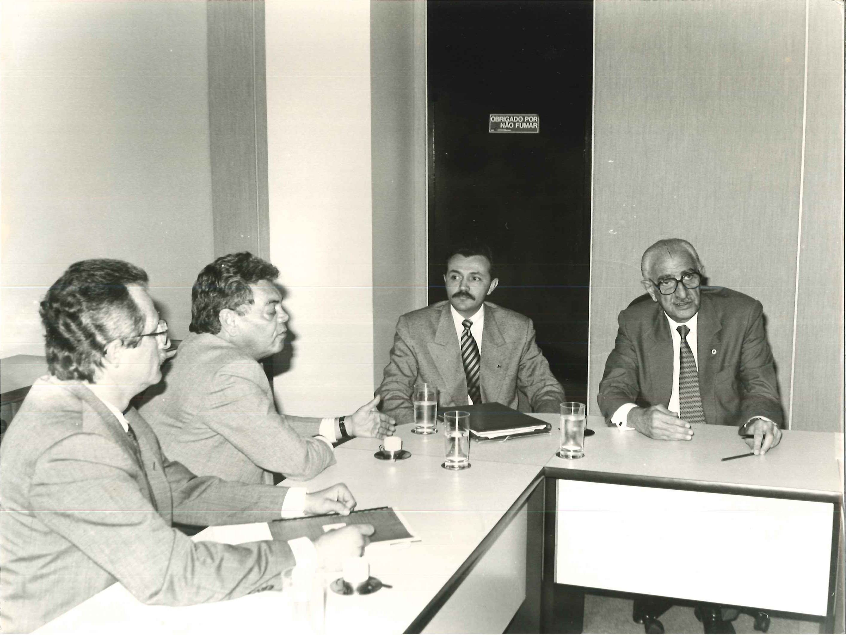 "Min. da Saúde, Jamil Haddad, acompanhado do seu chefe de gabinete, Carlos Siqueira, visitam o Pref. De Porto Alegre, Tarso Genrro (ao centro) em fevereiro de 1993."