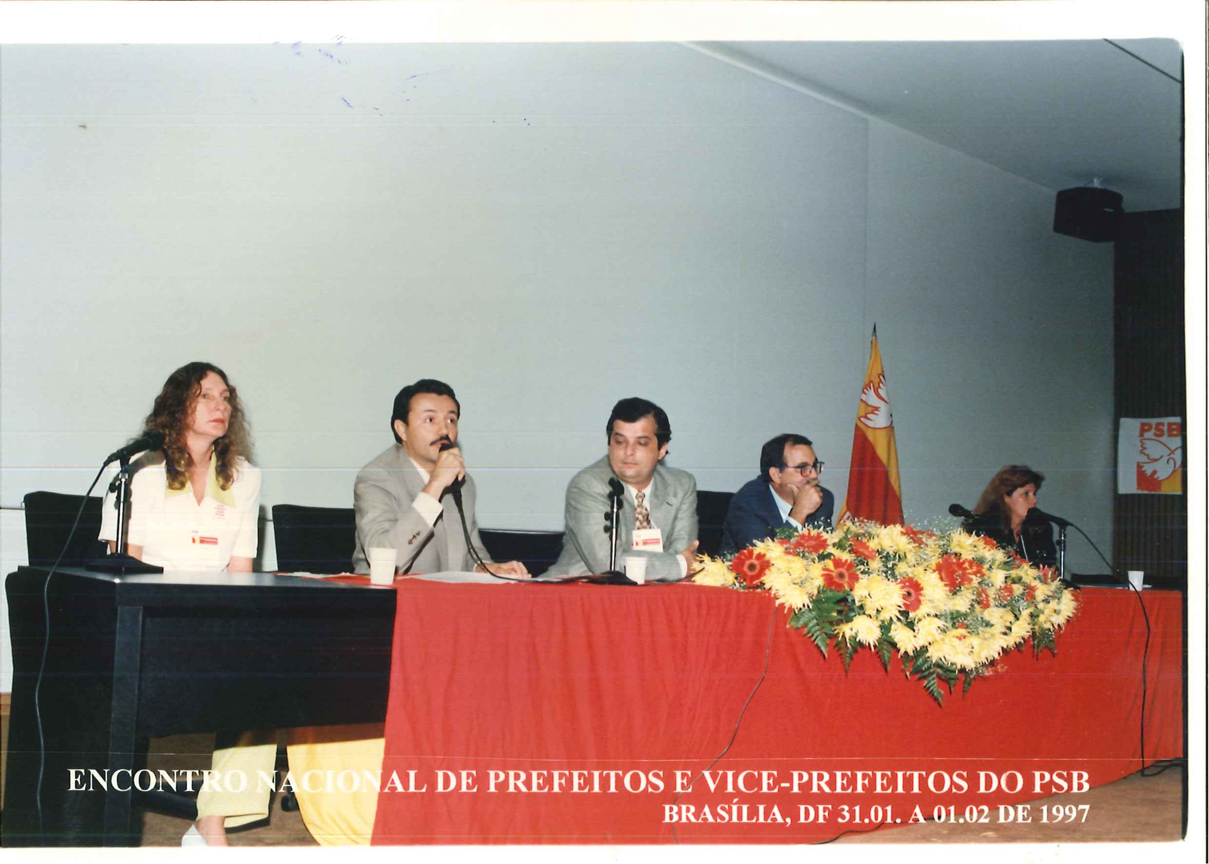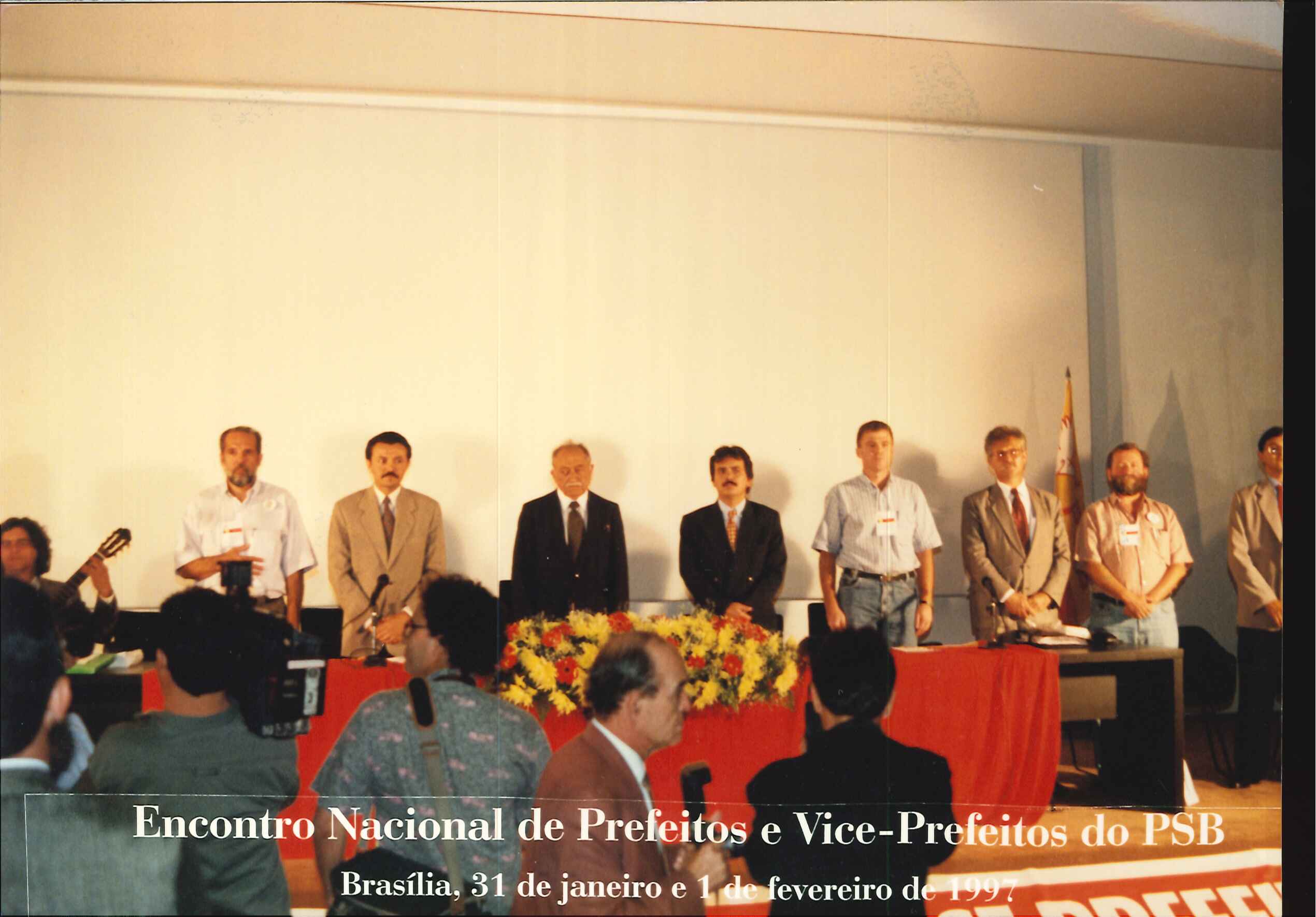 "Encontro Nacional de Prefeitos do PSB, realizado nos dias 31 de janeiro e 1º de fevereiro de 1997, no auditório Nereu Ramos na Câmara dos Deputados, em Brasília, DF. Da esquerda para a direita: Gilson Menezes, Carlos Siqueira, Miguel Arraes, Ademir Andrade, Casagrande e outros."