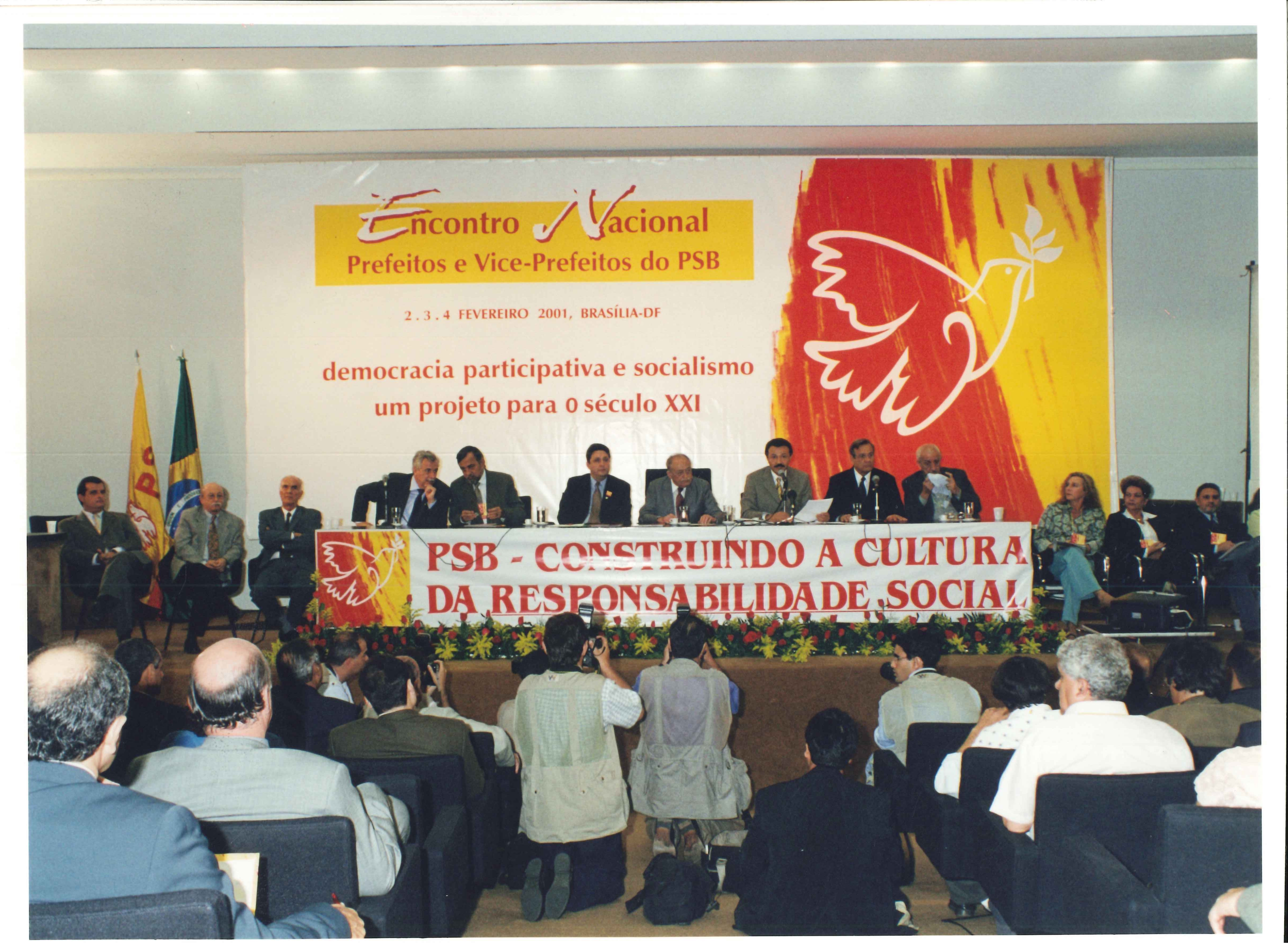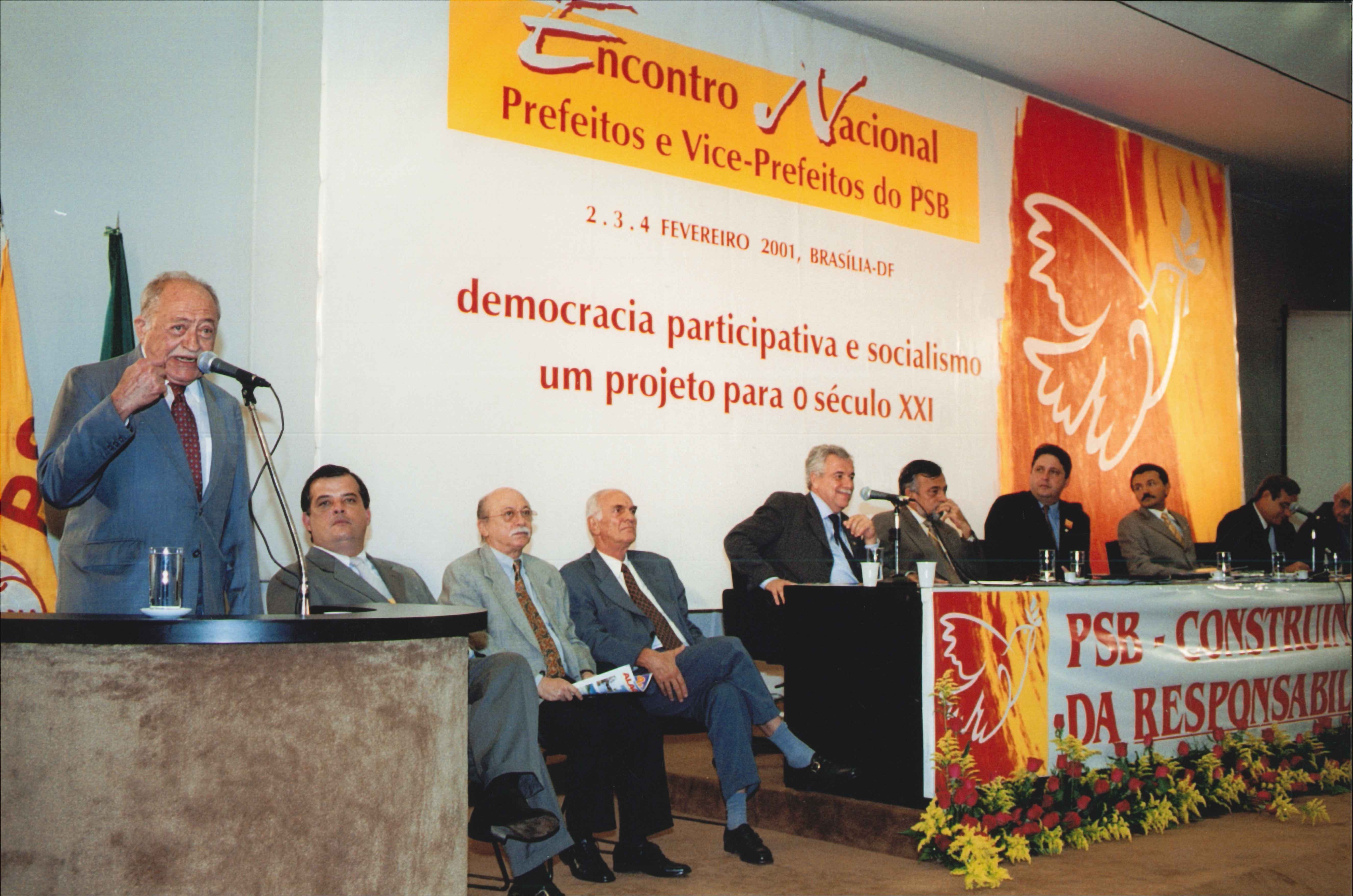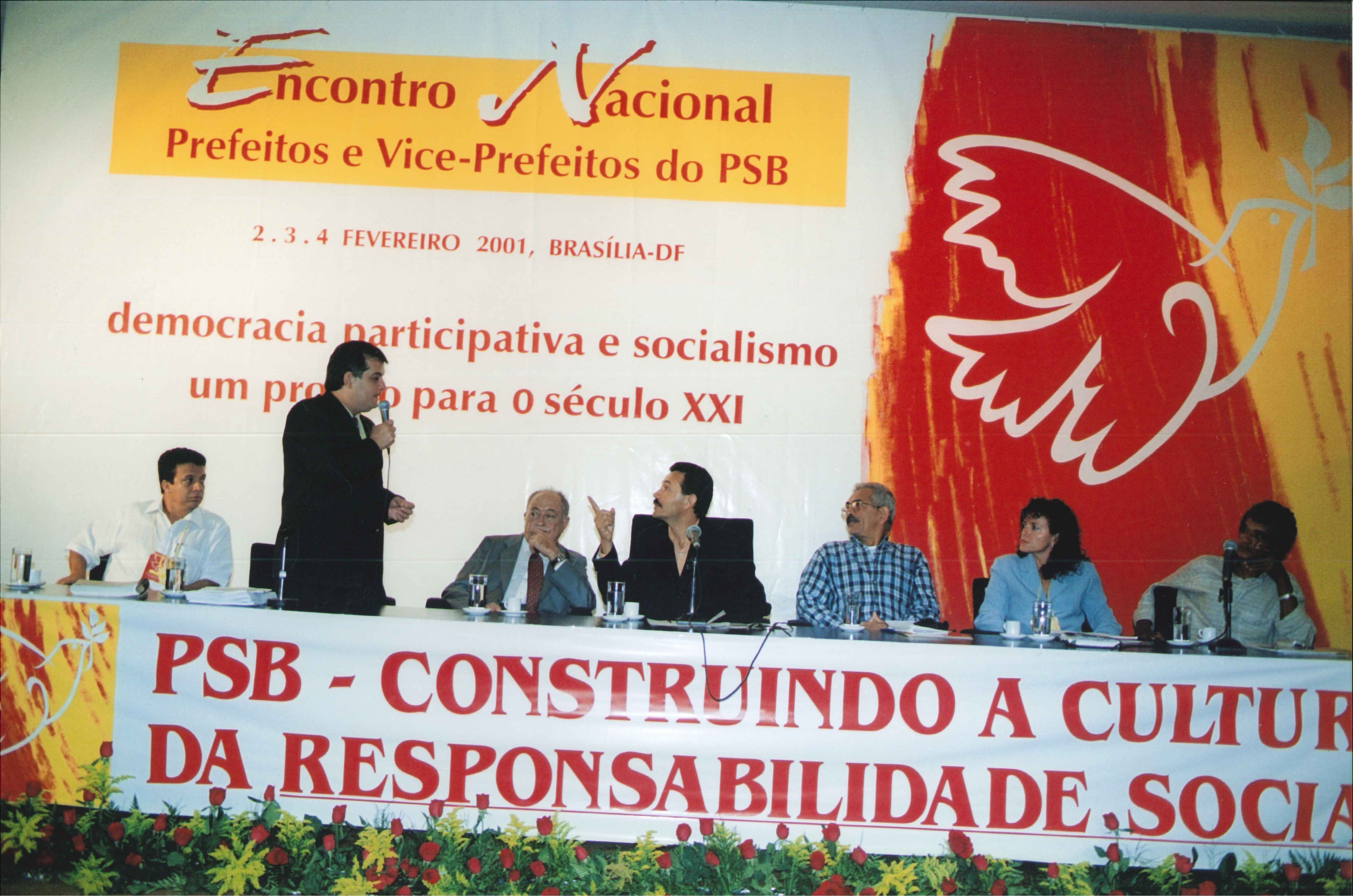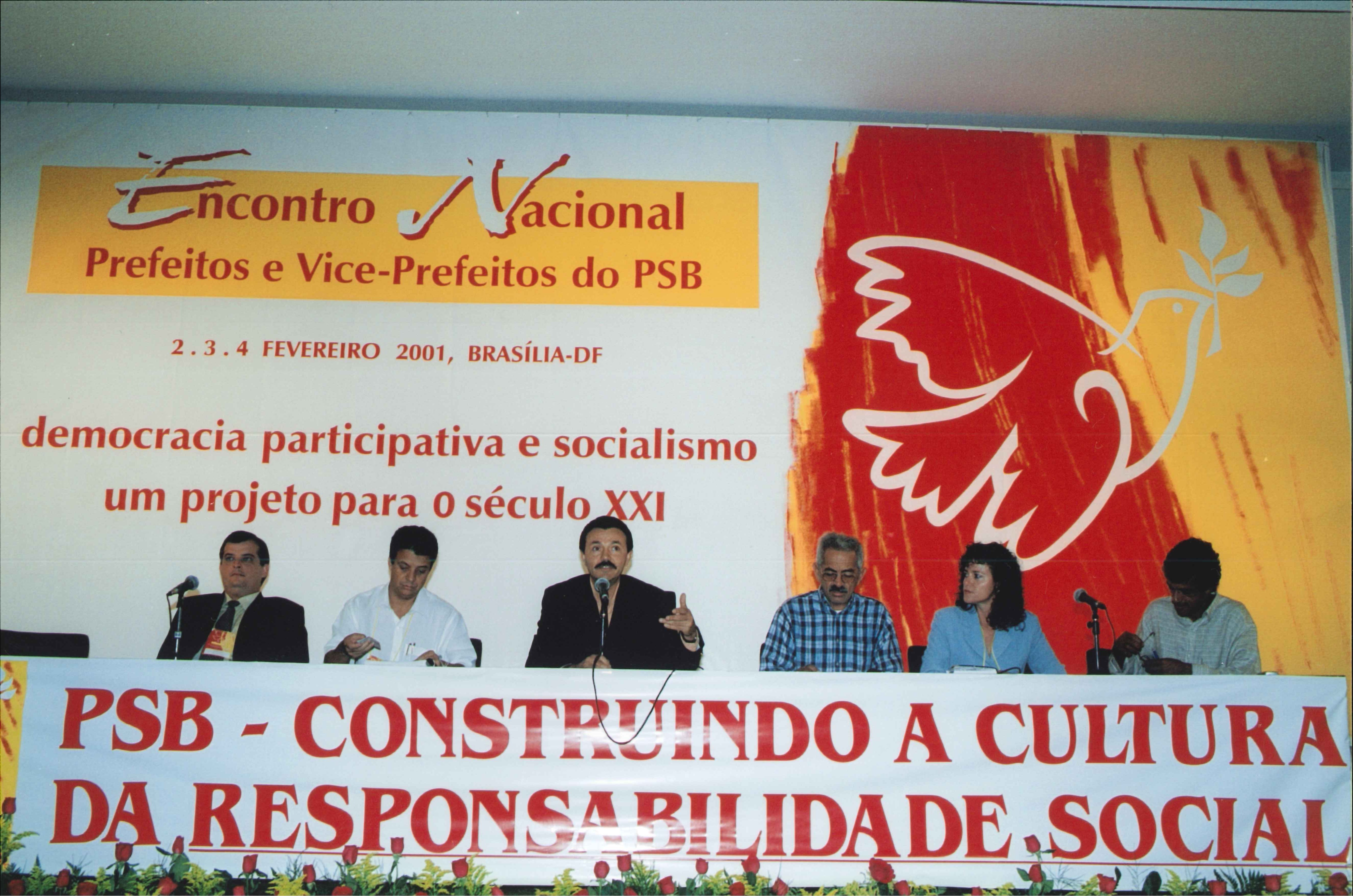 "Encontro Nacional de Prefeitos do PSB, realizado na Câmara dos Deputados nos dias 2, 3 e 4 de fevereiro de 2001. Por ocasião da abertura do encontro foi realizada a filiação do Governador do Rio de Janeiro Anthony Garotinho. Na mesa, da esquerda para direita: Márcio França, Roberto Amaral, Saturnino Braga, Alexandre Cardoso, Garotinho, Miguel Arraes, Carlos Siqueira, Ronaldo Lessa, Jamil Haddad, Kátia Born e Wilma de Faria. "