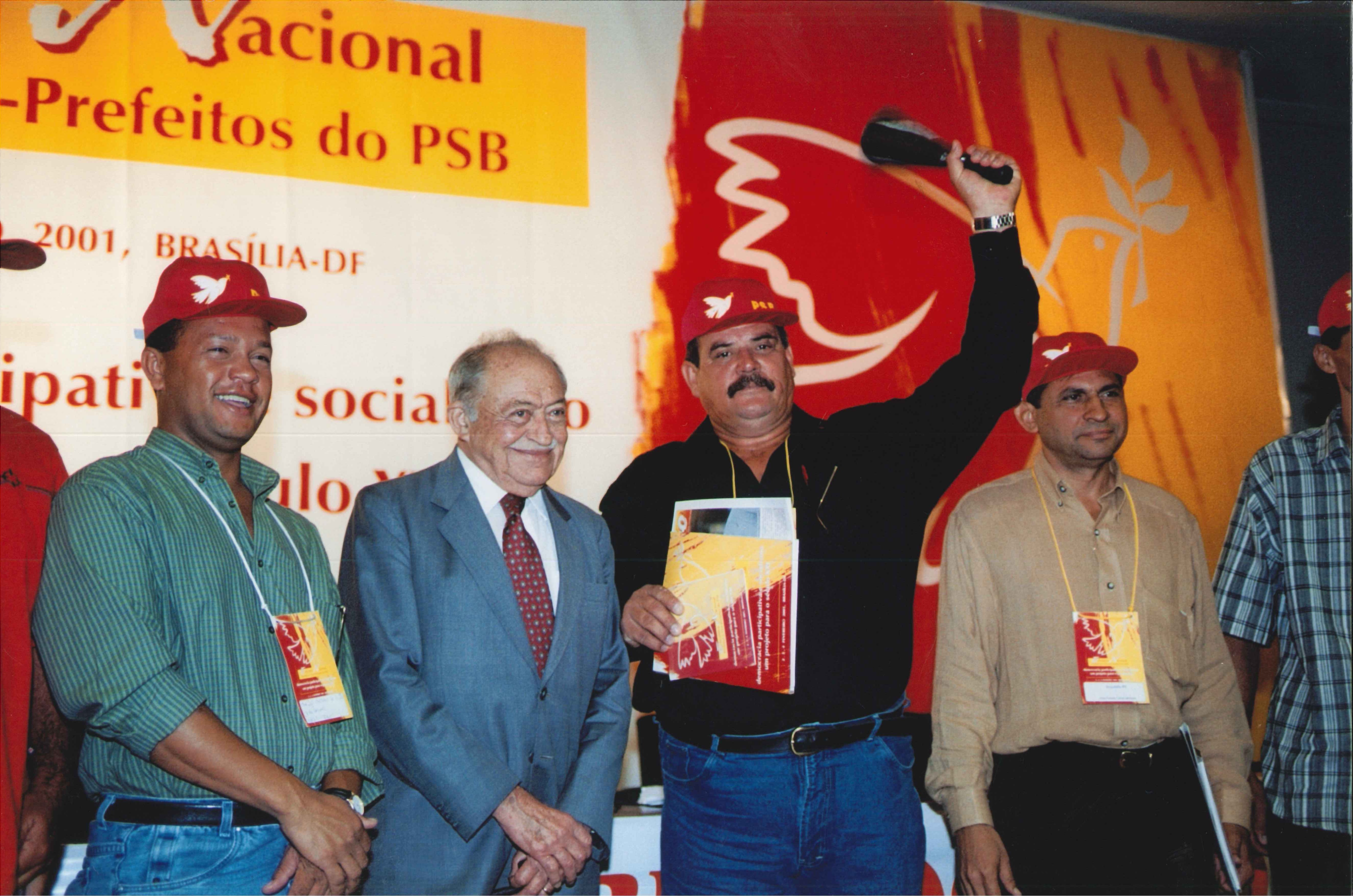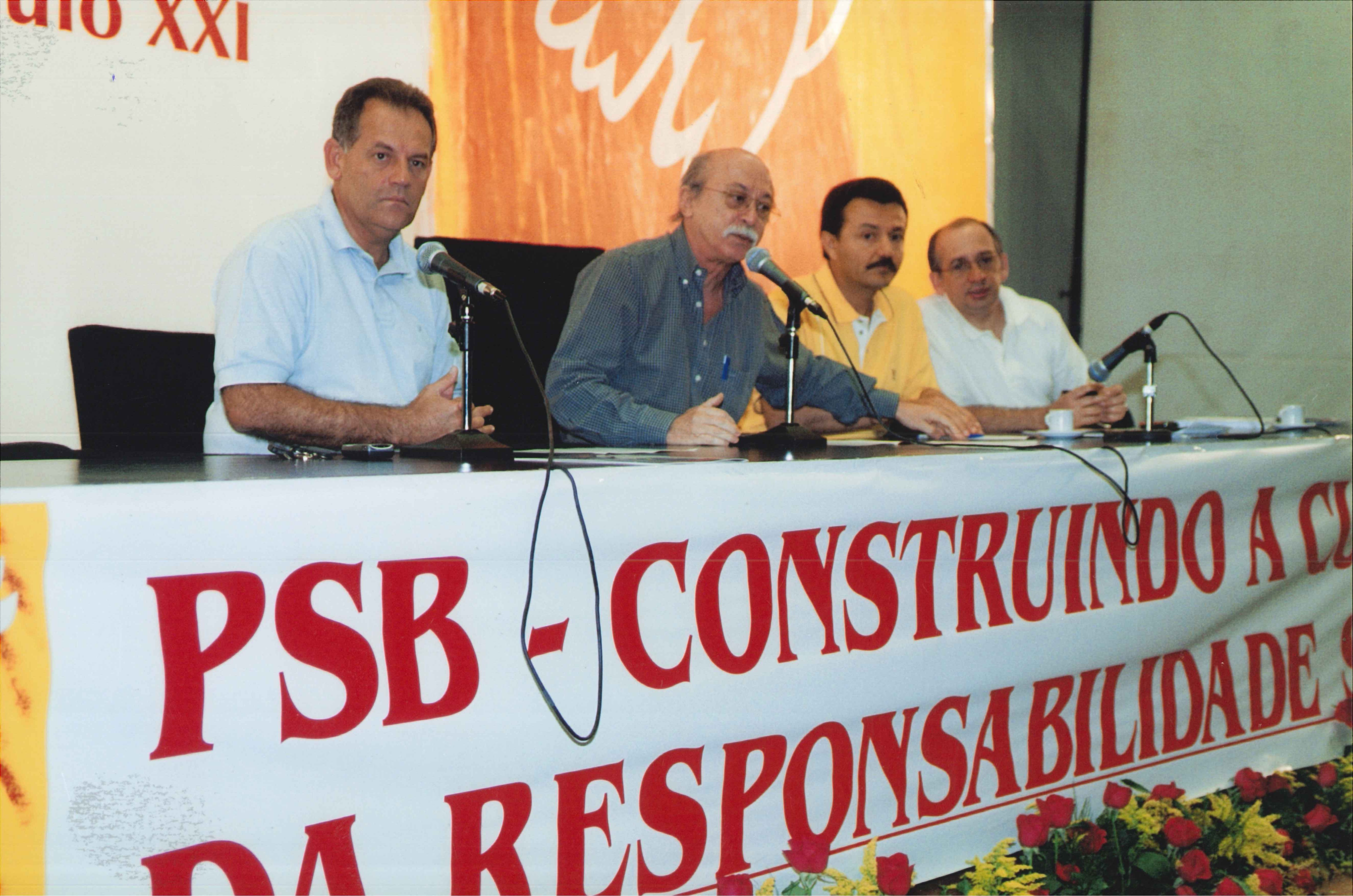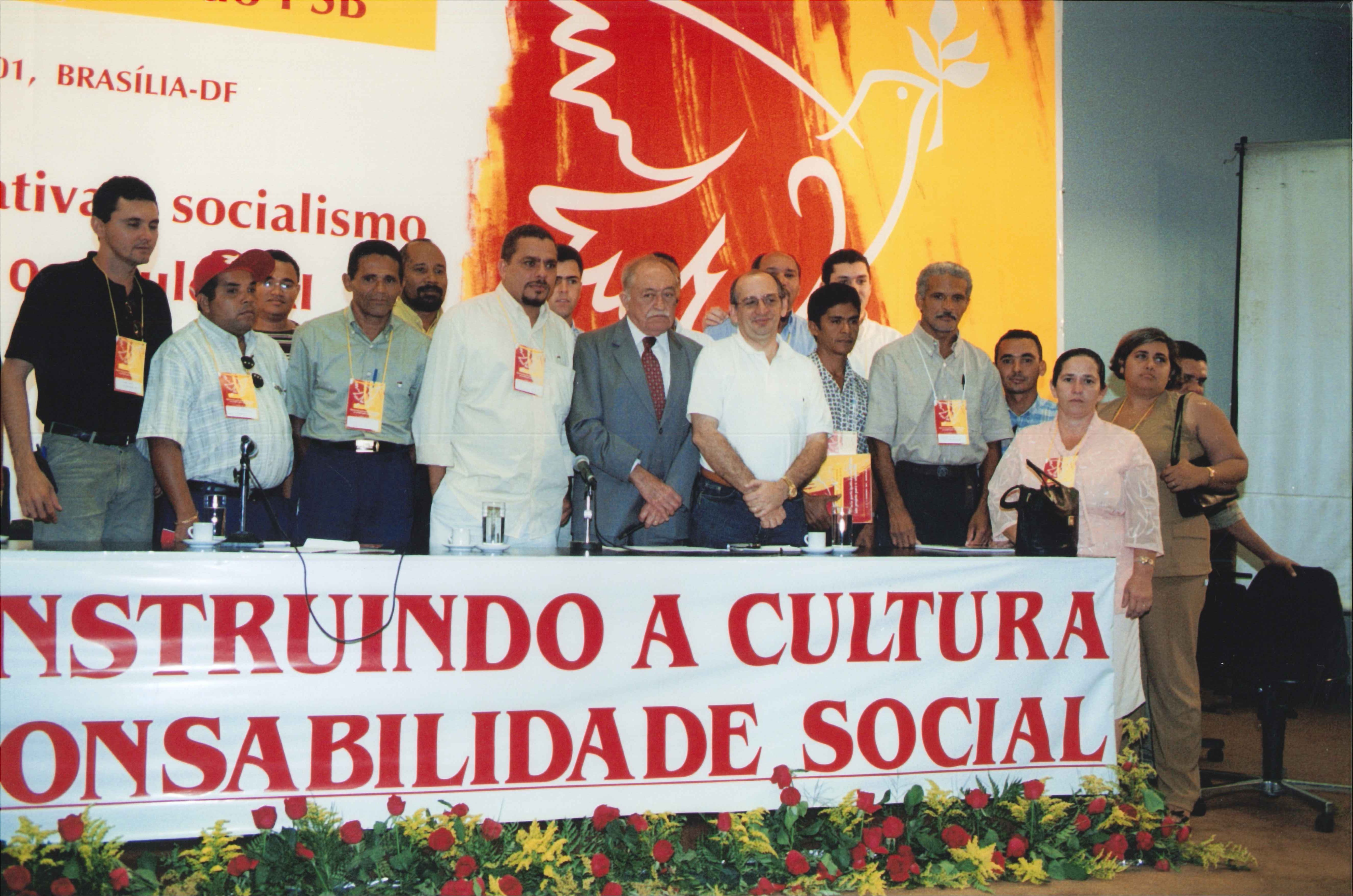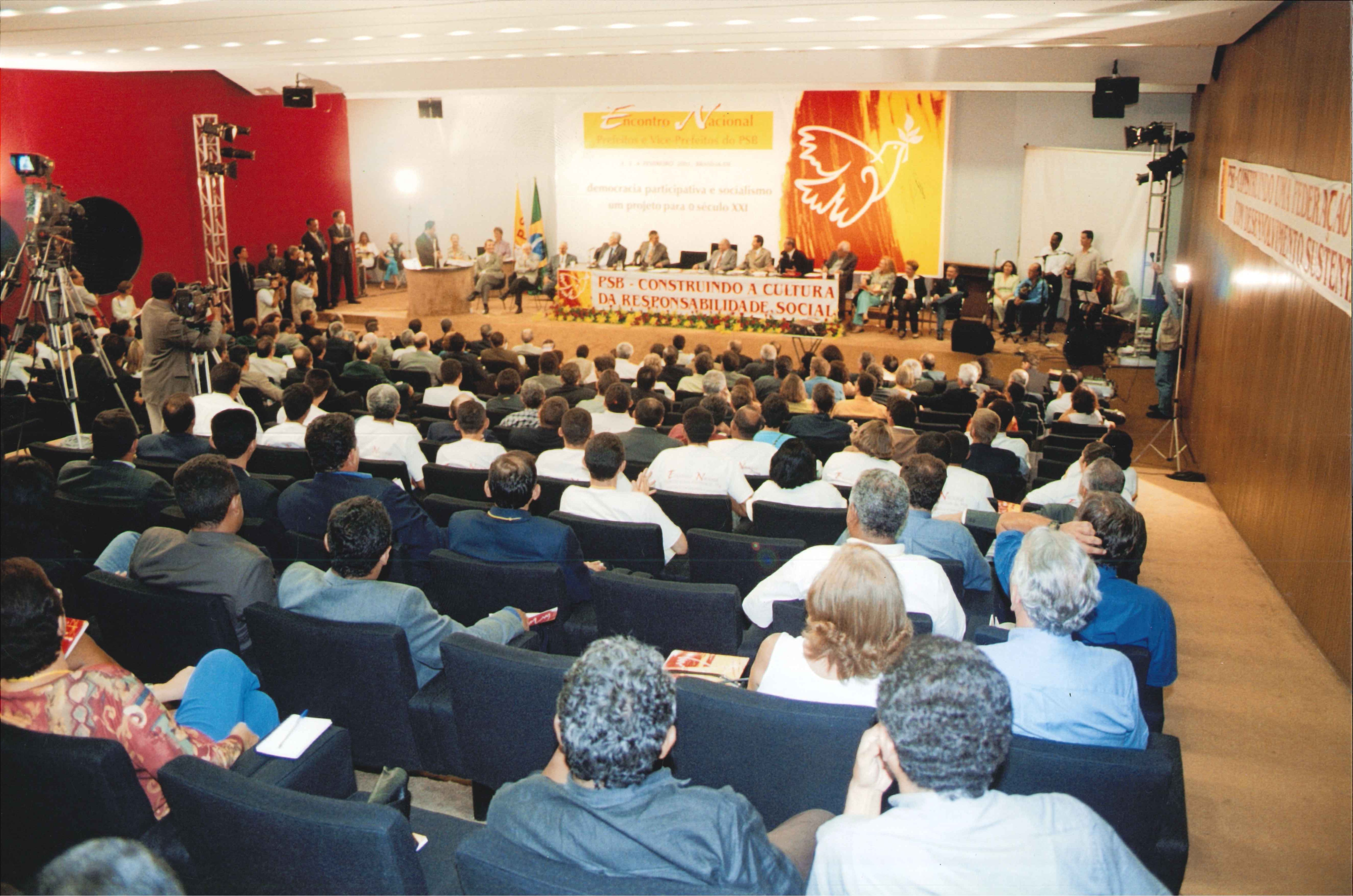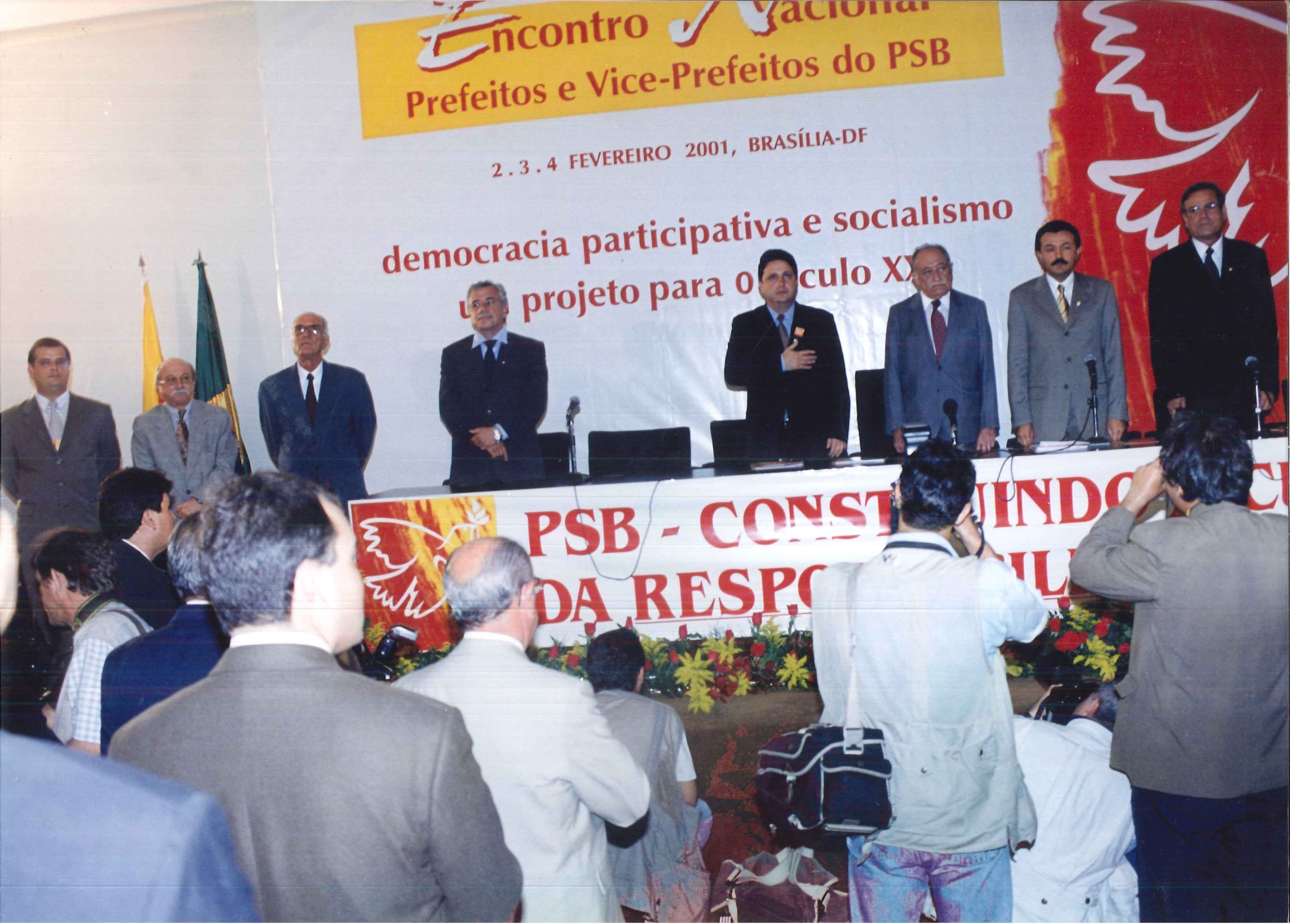 "Encontro Nacional de Prefeitos do PSB, realizado na Câmara dos Deputados nos dias 2, 3 e 4 de fevereiro de 2001. Por ocasião da abertura do encontro foi realizada a filiação do Governador do Rio de Janeiro Anthony Garotinho. Na mesa, da esquerda para direita: Márcio França, Roberto Amaral, Saturnino Braga, Alexandre Cardoso, Garotinho, Miguel Arraes, Carlos Siqueira, Ronaldo Lessa, Jamil Haddad, Kátia Born e Wilma de Faria. "