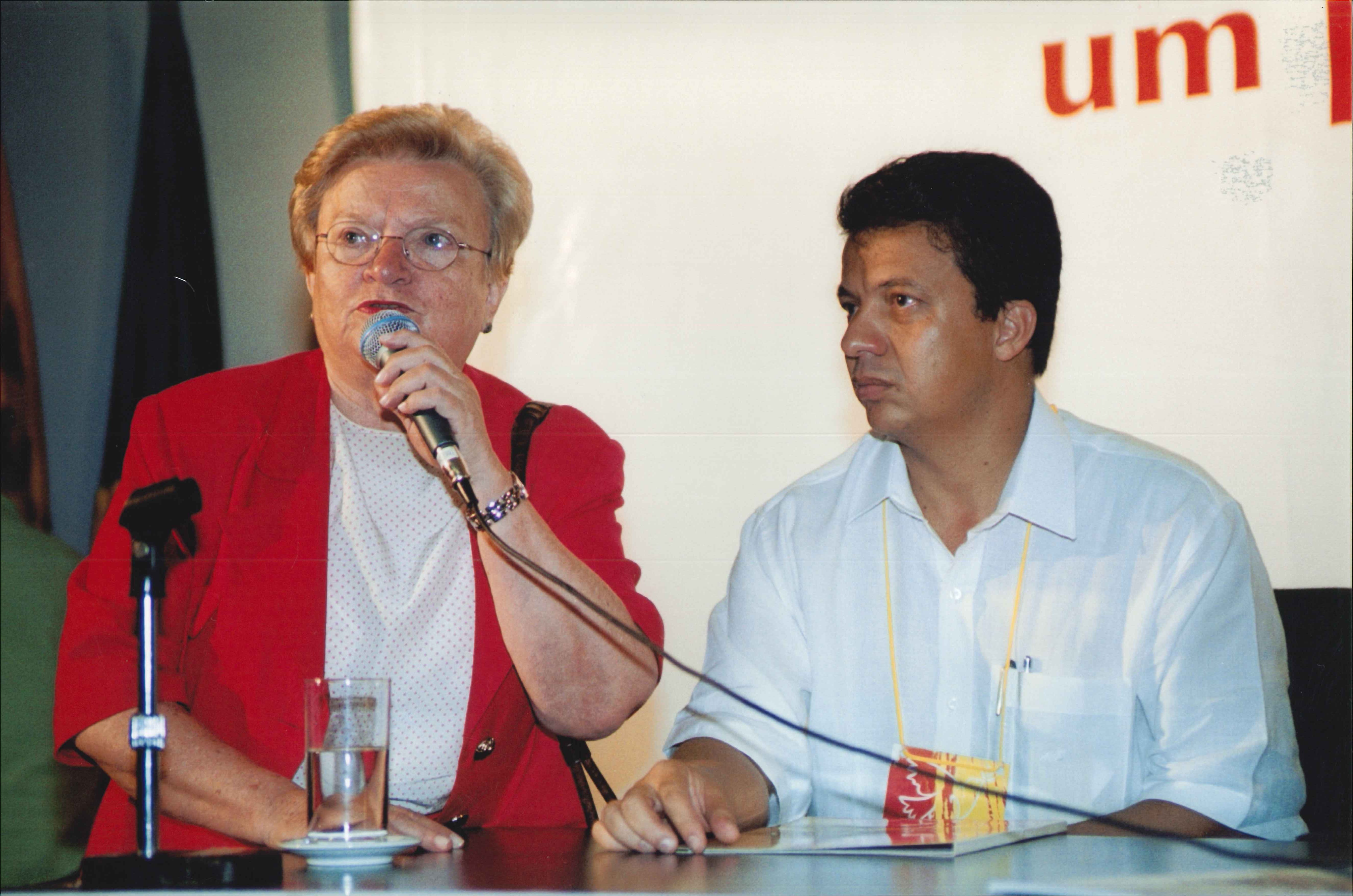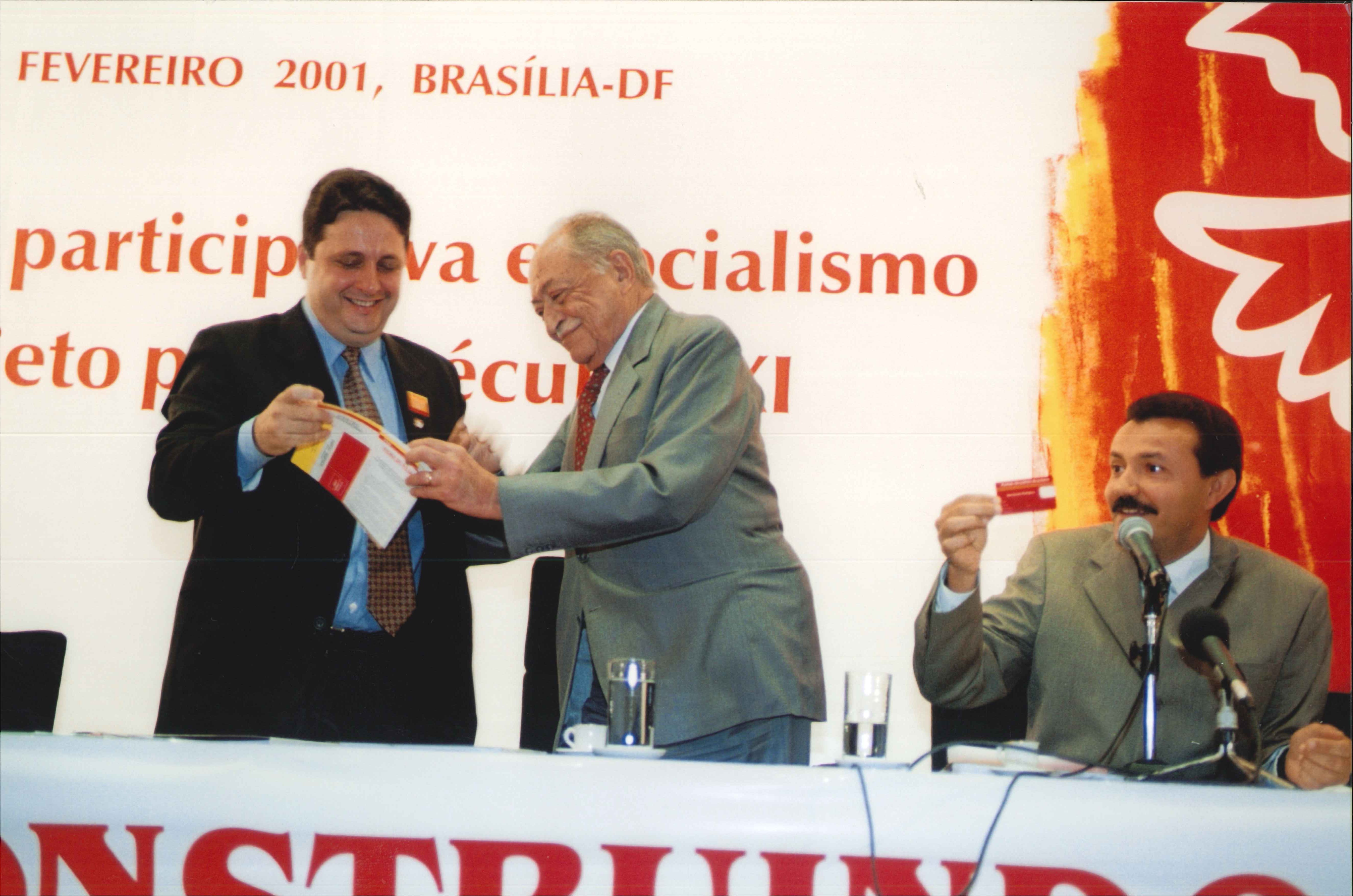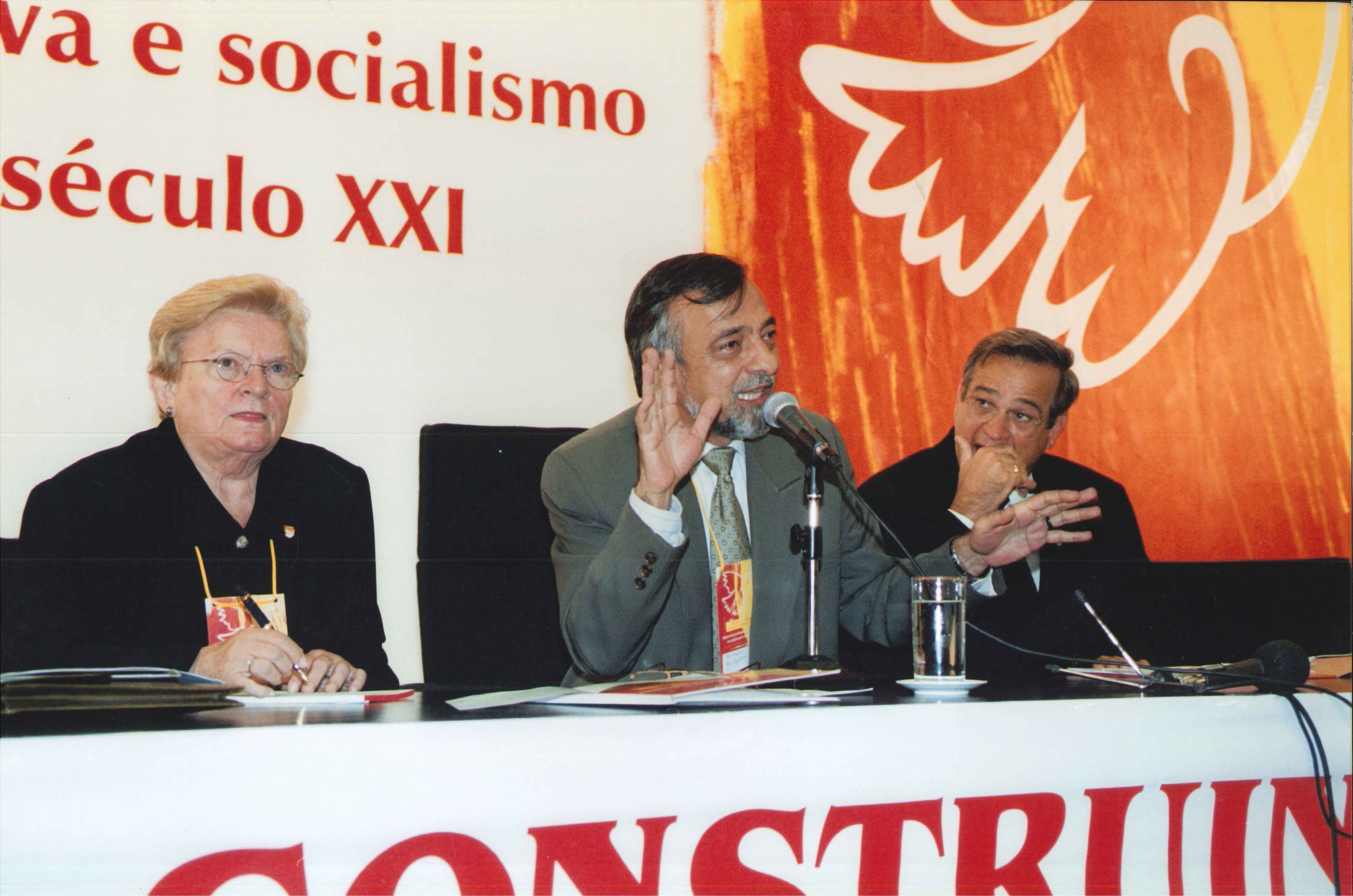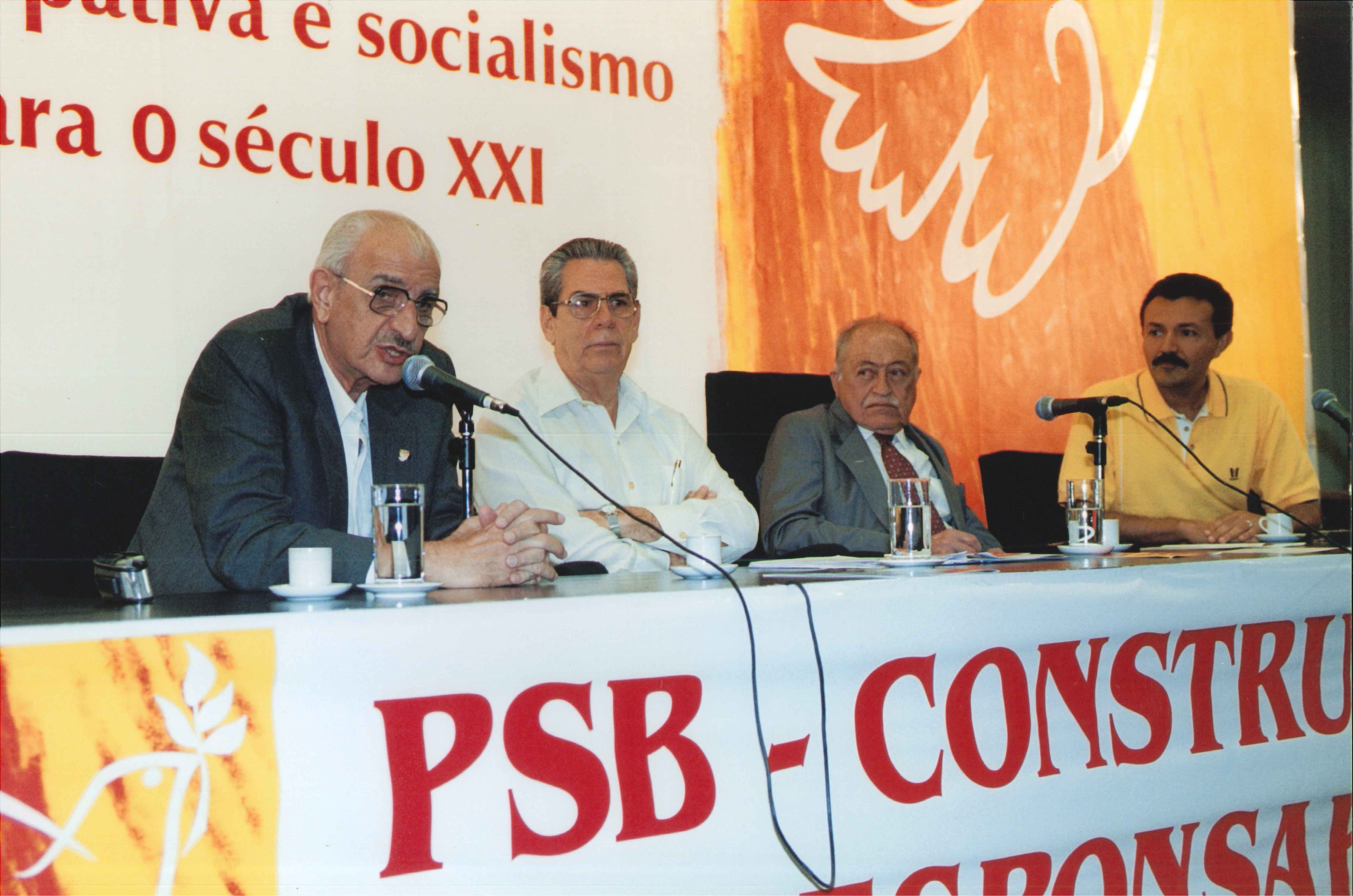"Encontro Nacional de Prefeitos do PSB, realizado na Câmara dos Deputados nos dias 2, 3 e 4 de fevereiro de 2001. Por ocasião da abertura do encontro foi realizada a filiação do Governador do Rio de Janeiro Anthony Garotinho. Na mesa, da esquerda para direita: Márcio França, Roberto Amaral, Saturnino Braga, Alexandre Cardoso, Garotinho, Miguel Arraes, Carlos Siqueira, Ronaldo Lessa, Jamil Haddad, Kátia Born e Wilma de Faria. "