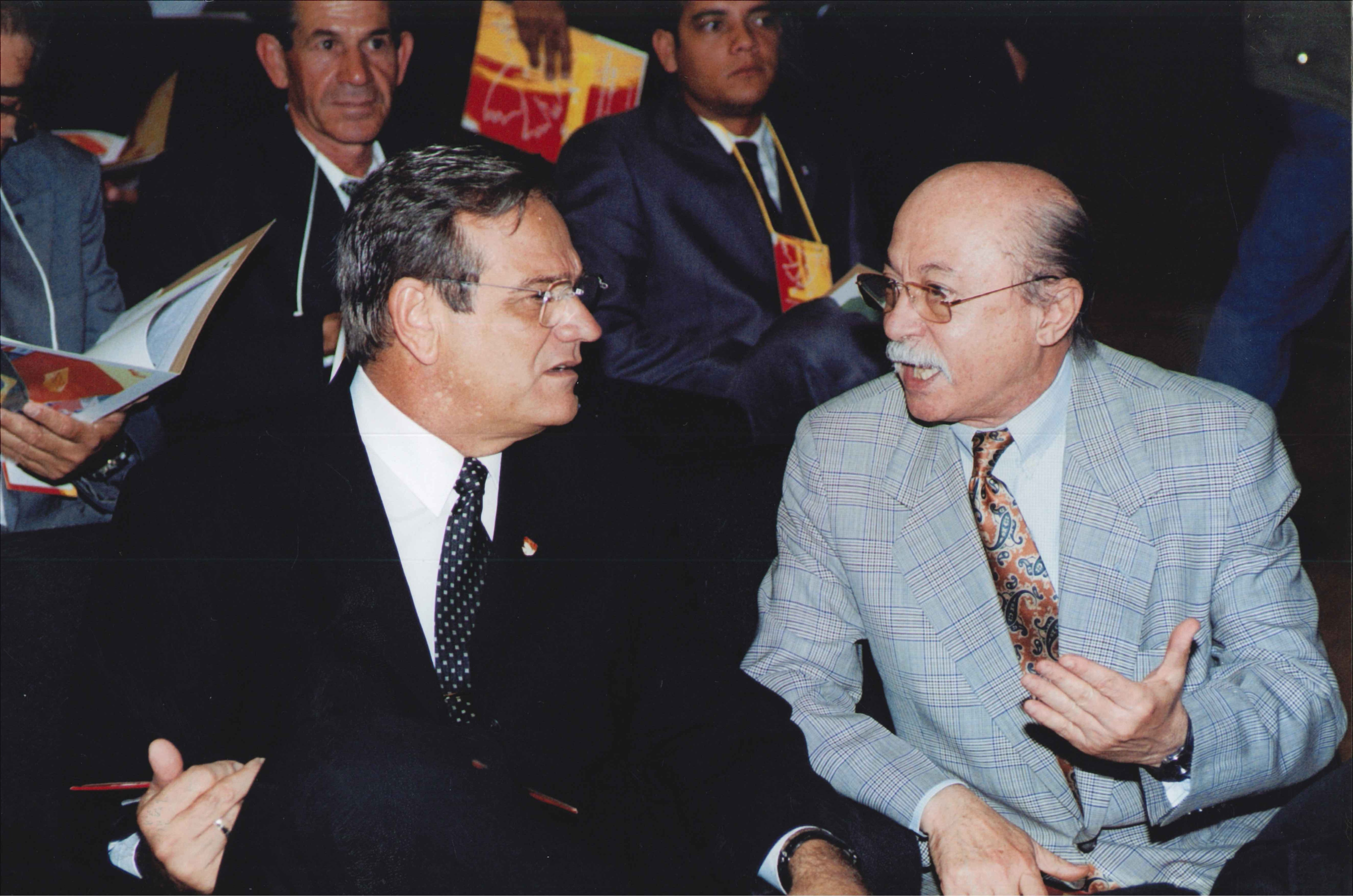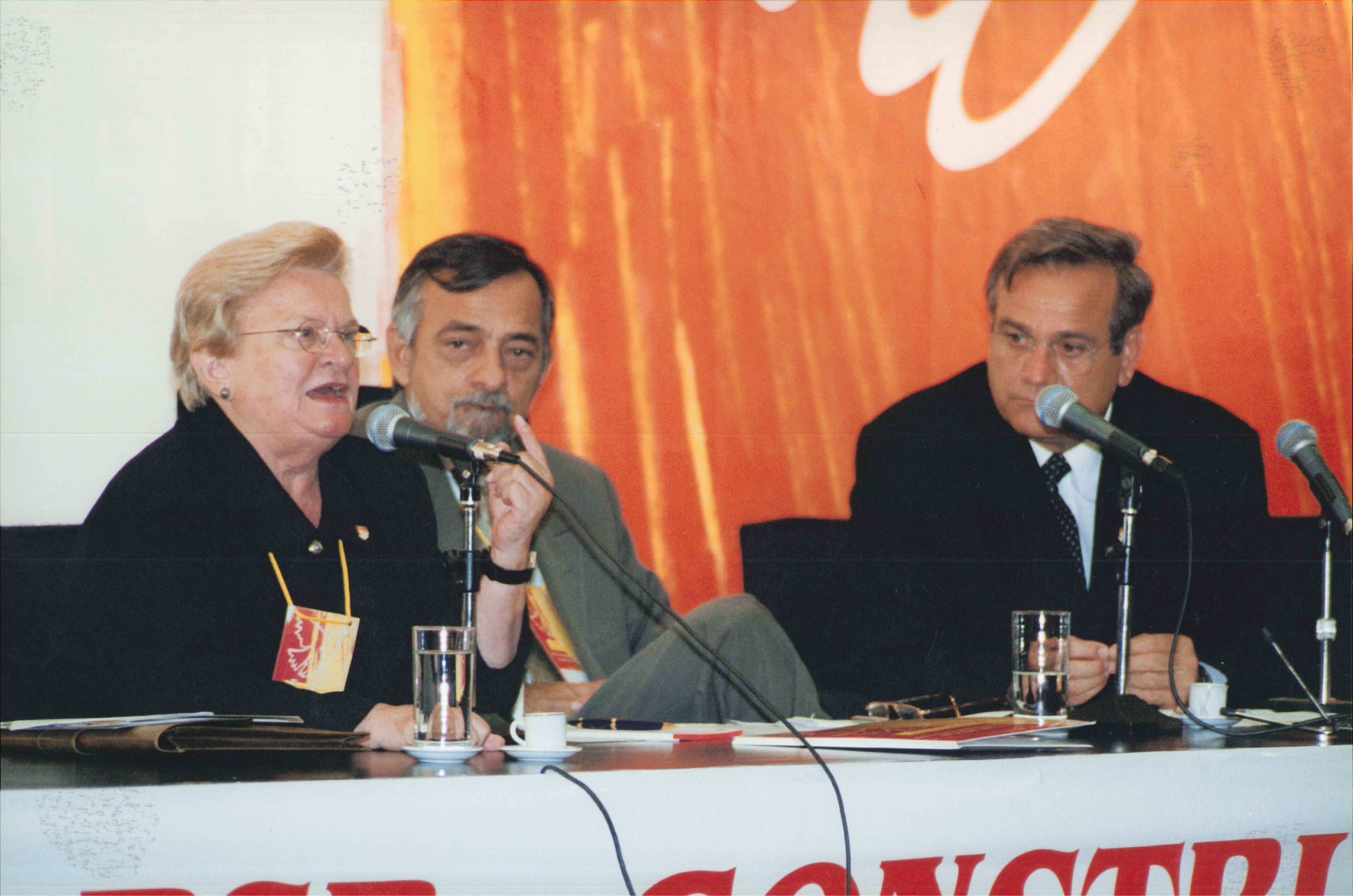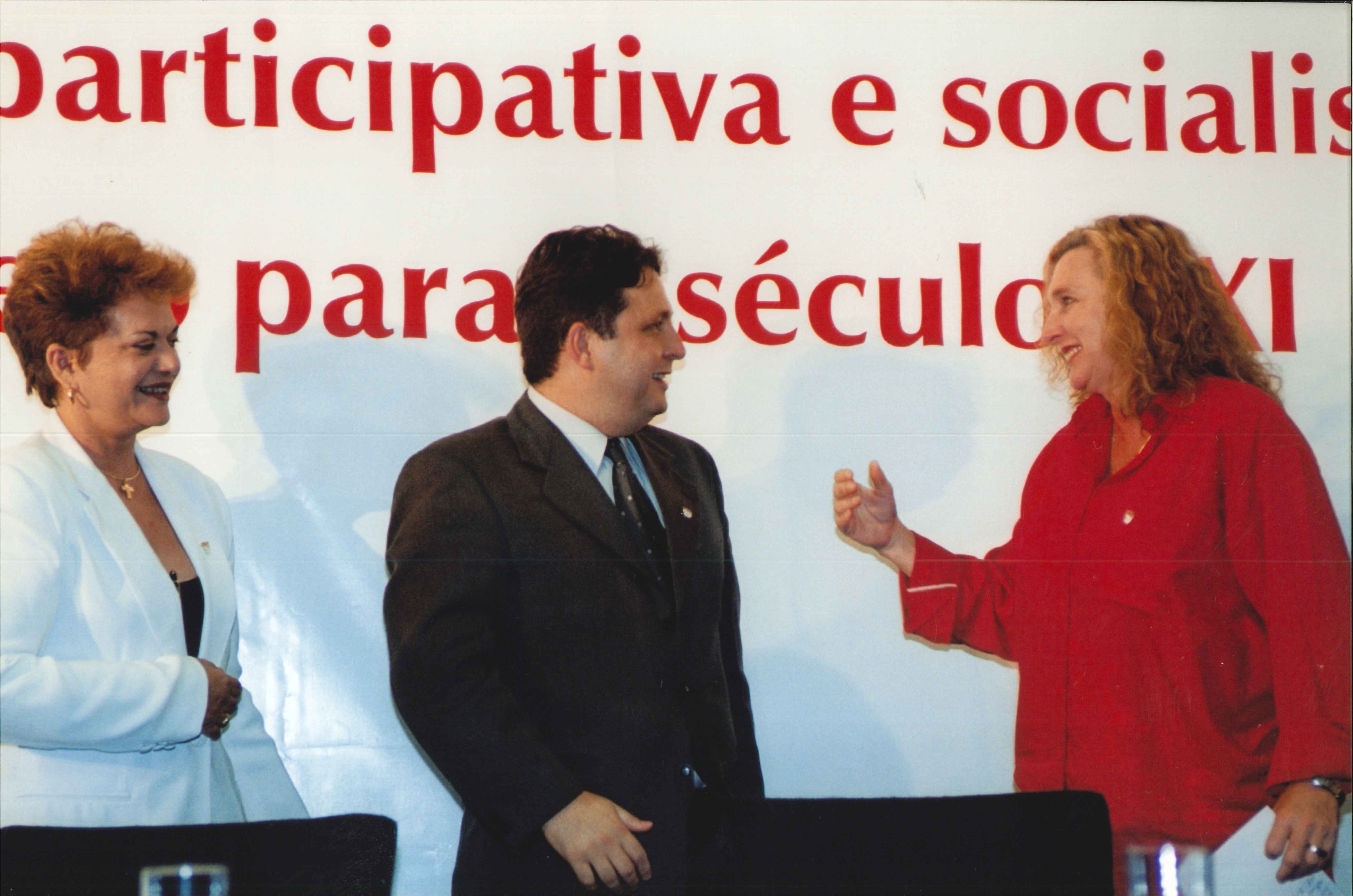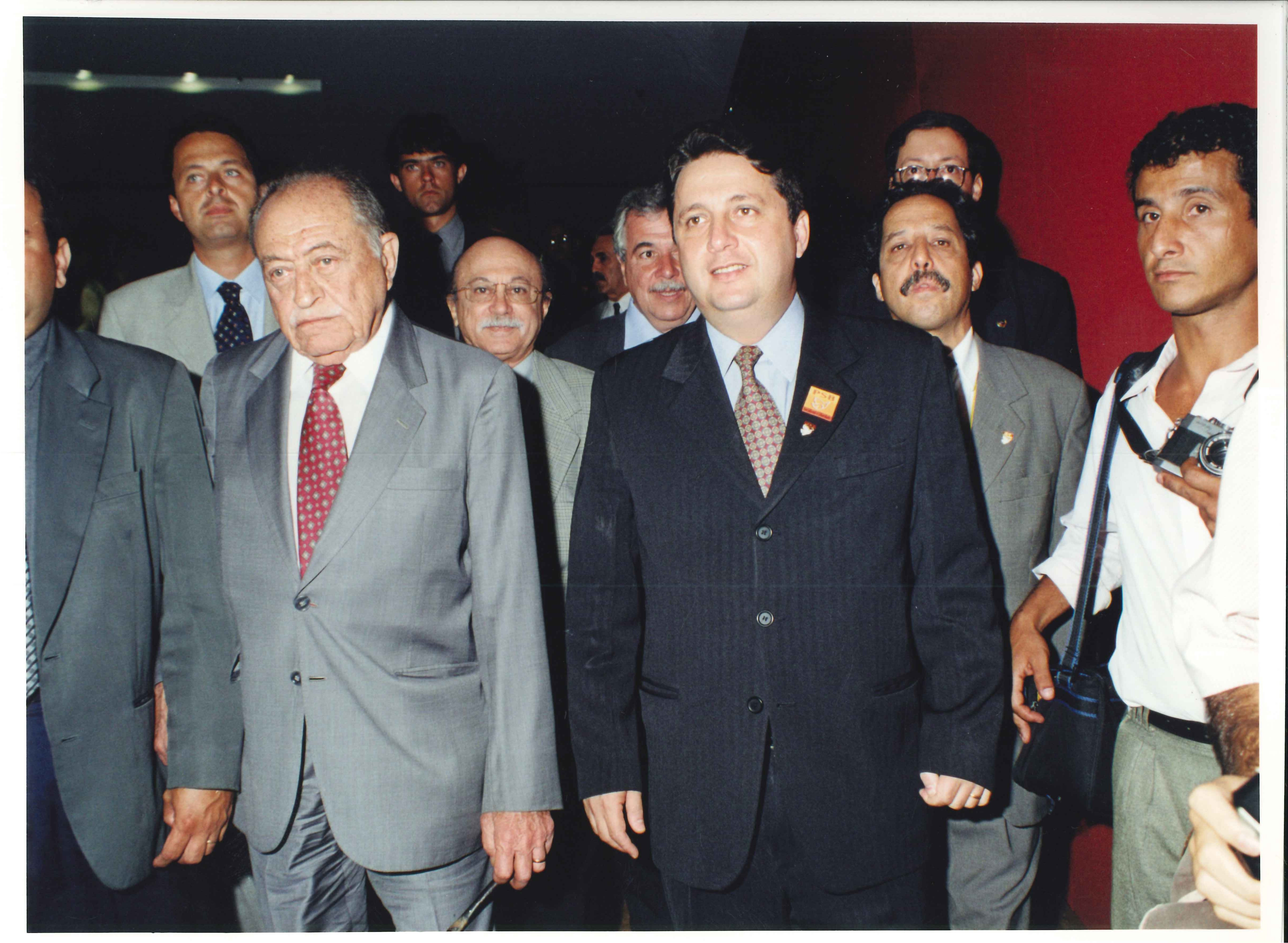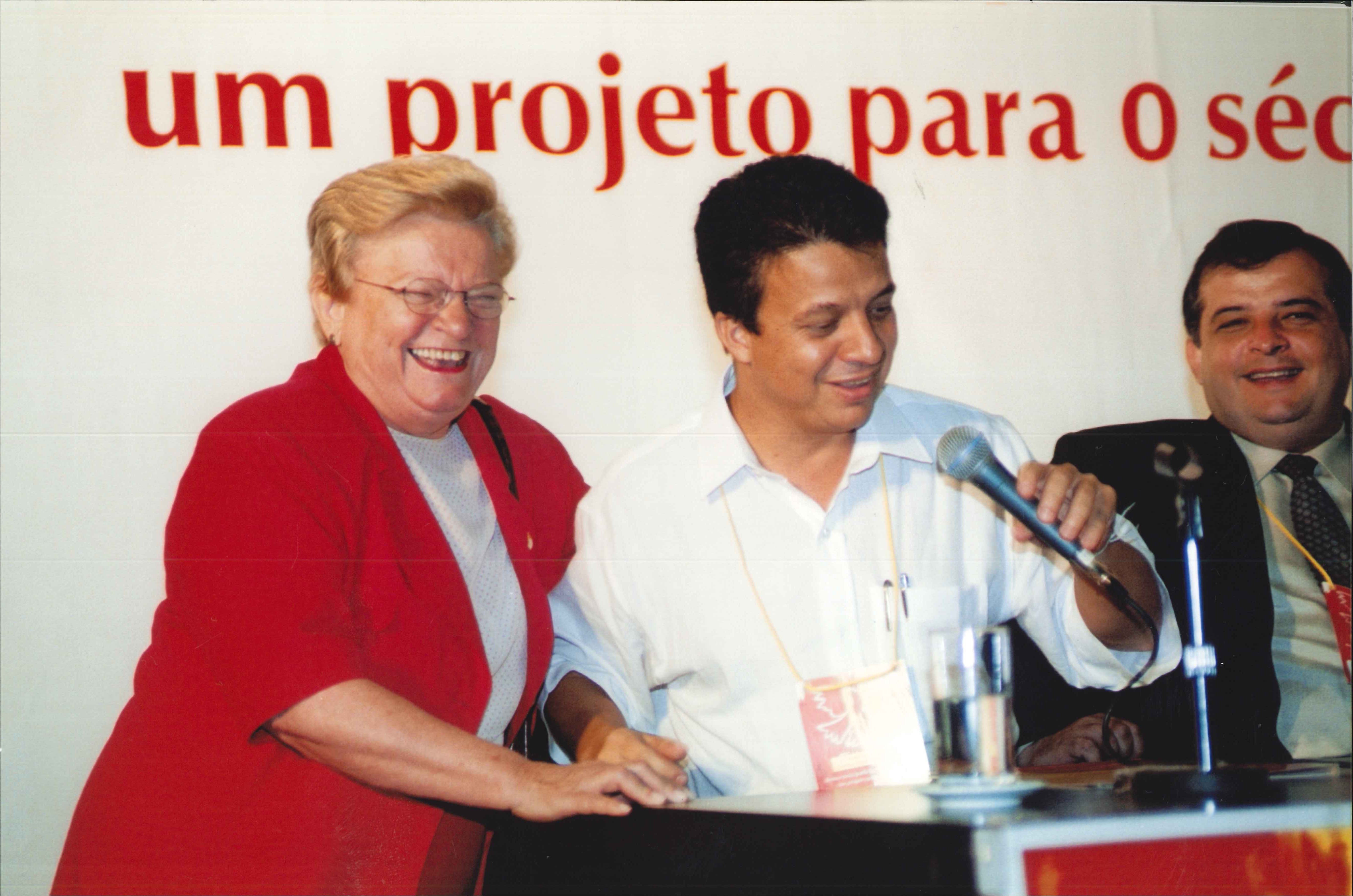 "Encontro Nacional de Prefeitos do PSB, realizado na Câmara dos Deputados nos dias 2, 3 e 4 de fevereiro de 2001. Por ocasião da abertura do encontro foi realizada a filiação do Governador do Rio de Janeiro Anthony Garotinho. Na mesa, da esquerda para direita: Márcio França, Roberto Amaral, Saturnino Braga, Alexandre Cardoso, Garotinho, Miguel Arraes, Carlos Siqueira, Ronaldo Lessa, Jamil Haddad, Kátia Born e Wilma de Faria. "