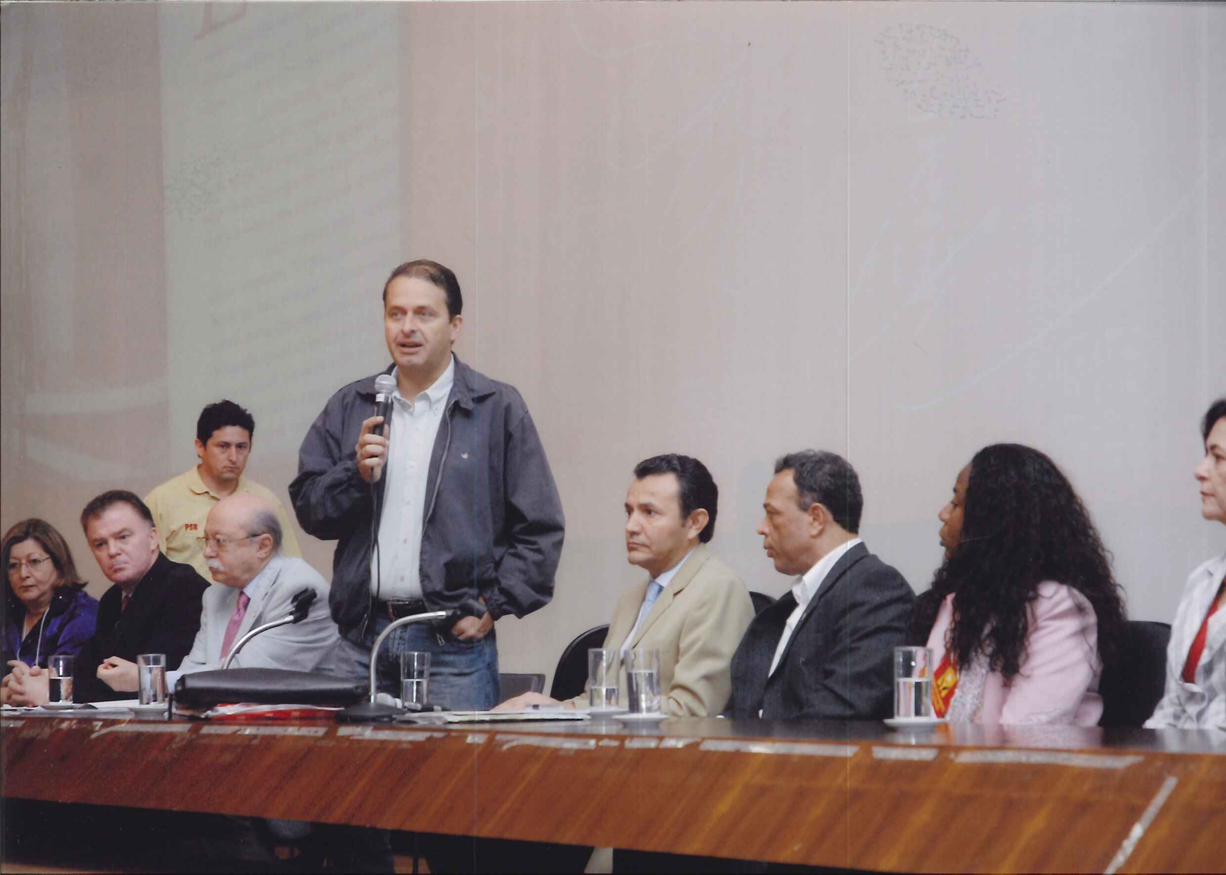 Mesa do XI Congresso. Da direita para a esquerda: Vice gov. Wilson Martins, Dep. Ciro Gomes, Dep. Marcio França, Vice-presidente Roberto Amaral, Sec. Carlos Siqueira, Presidente Eduardo Campos, Sec. Mari Machado, Sen. Casagrande, Dep. Ricardo Berzoini (Presidente do PT), Dep. Ana Arraes, Dep. Erundina e o Dep. Alexandre Cardoso.