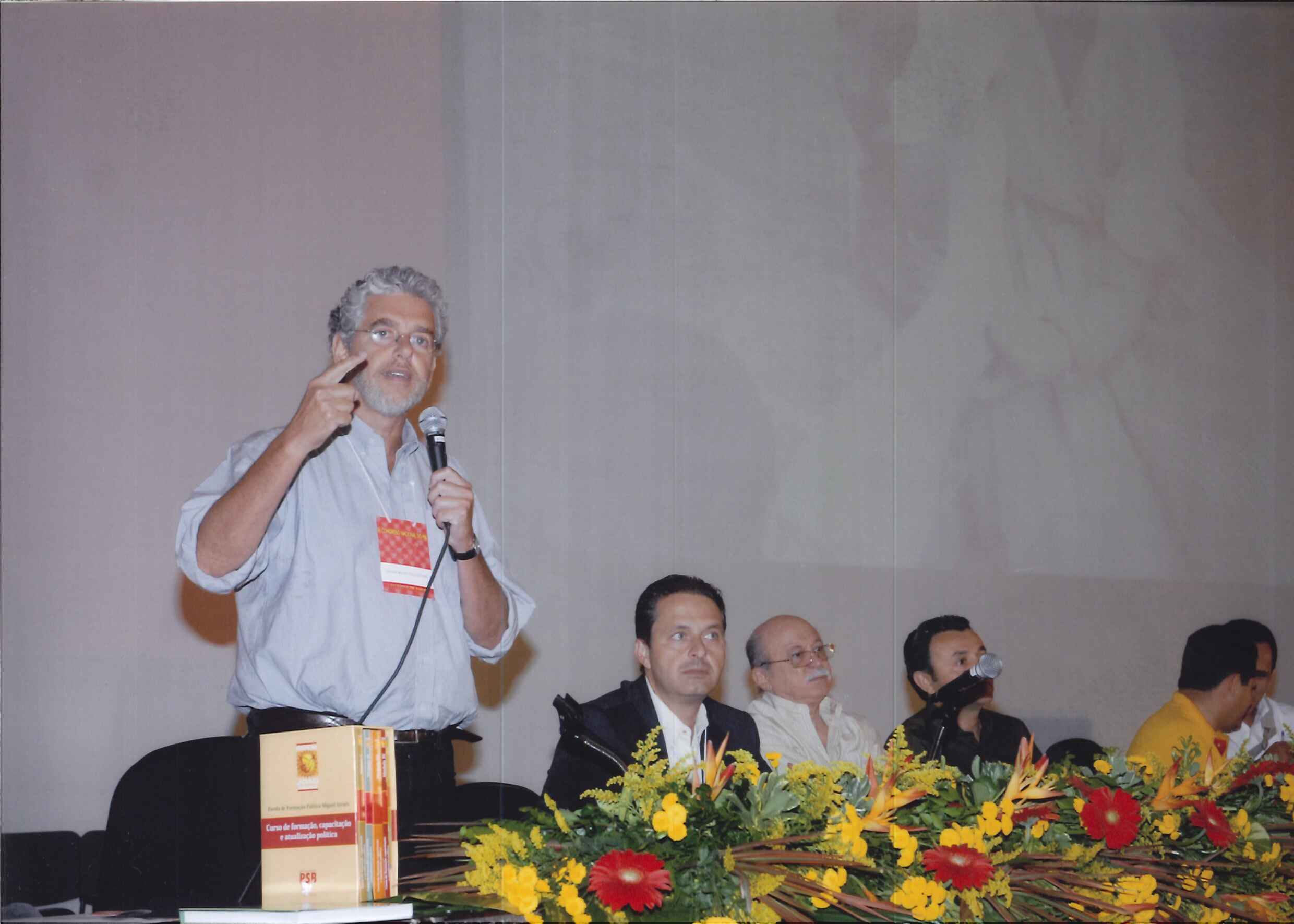 Mesa do Congresso Nacional do Movimento Popular do PSB, na ocasião em que o primeiro secretário, Carlos Siqueira (ao microfone) faz a sua saudação aos militantes do movimento.