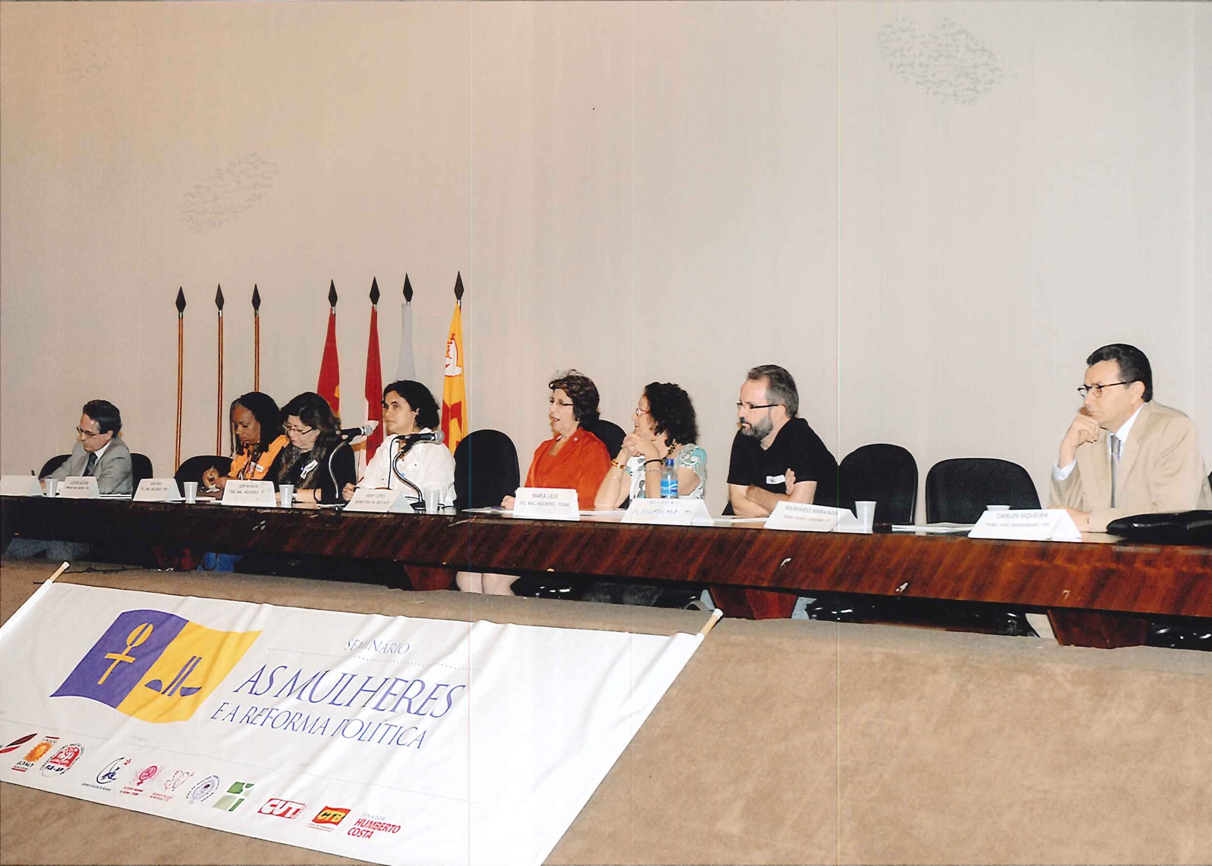 "Mesa do Seminário: As Mulheres e a Reforma Política. Ao centro a ministra Irine e representantes de partidos políticos e entidades da sociedade civil."