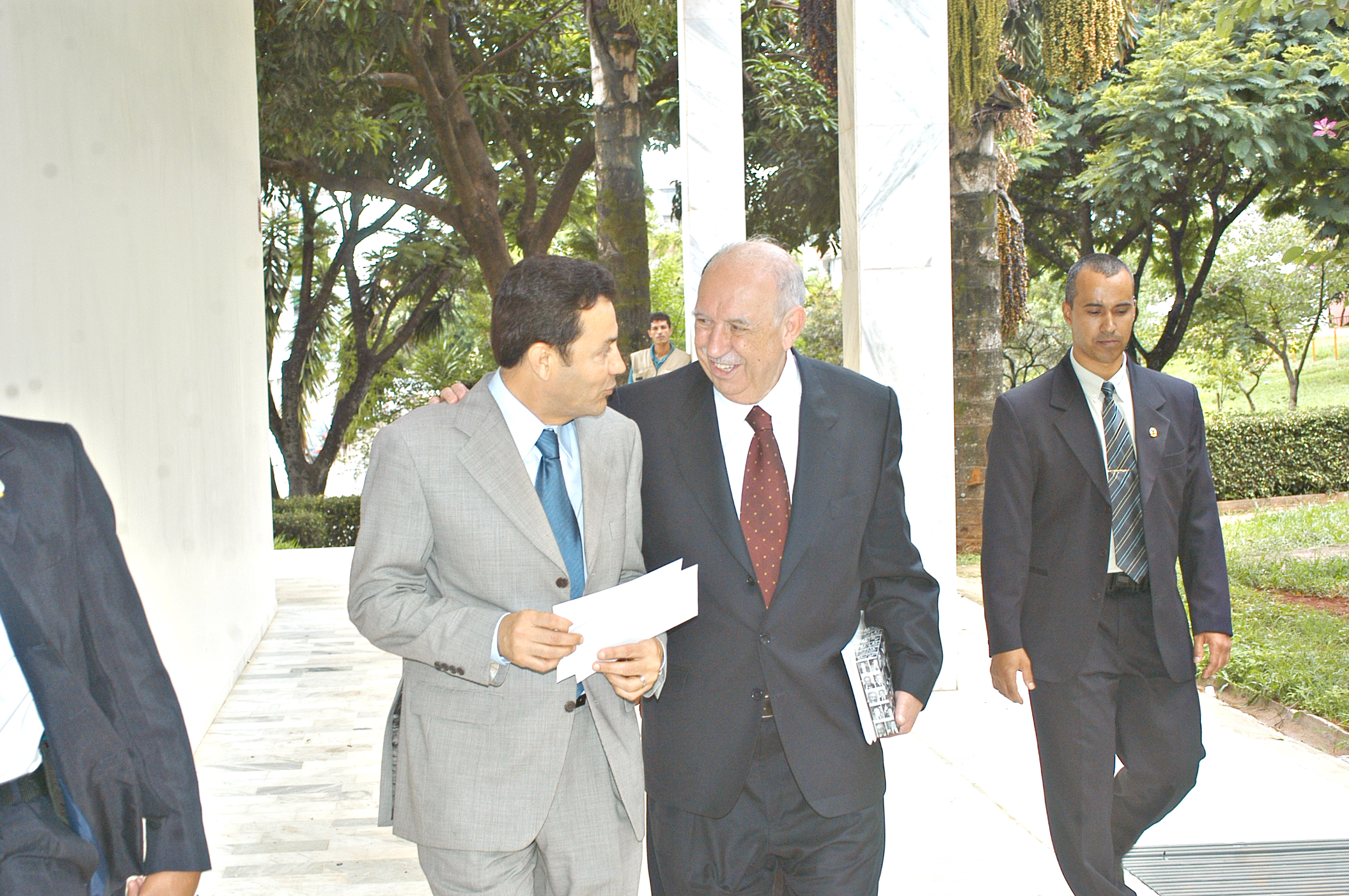 "O Vice Presidente da República, José de Alencar, é recebido por Carlos Siqueira, que o conduz ao auditório Miguel Arraes na Sede Nacional do PSB, para participar do Seminário Alternativas à Política Econômica."
