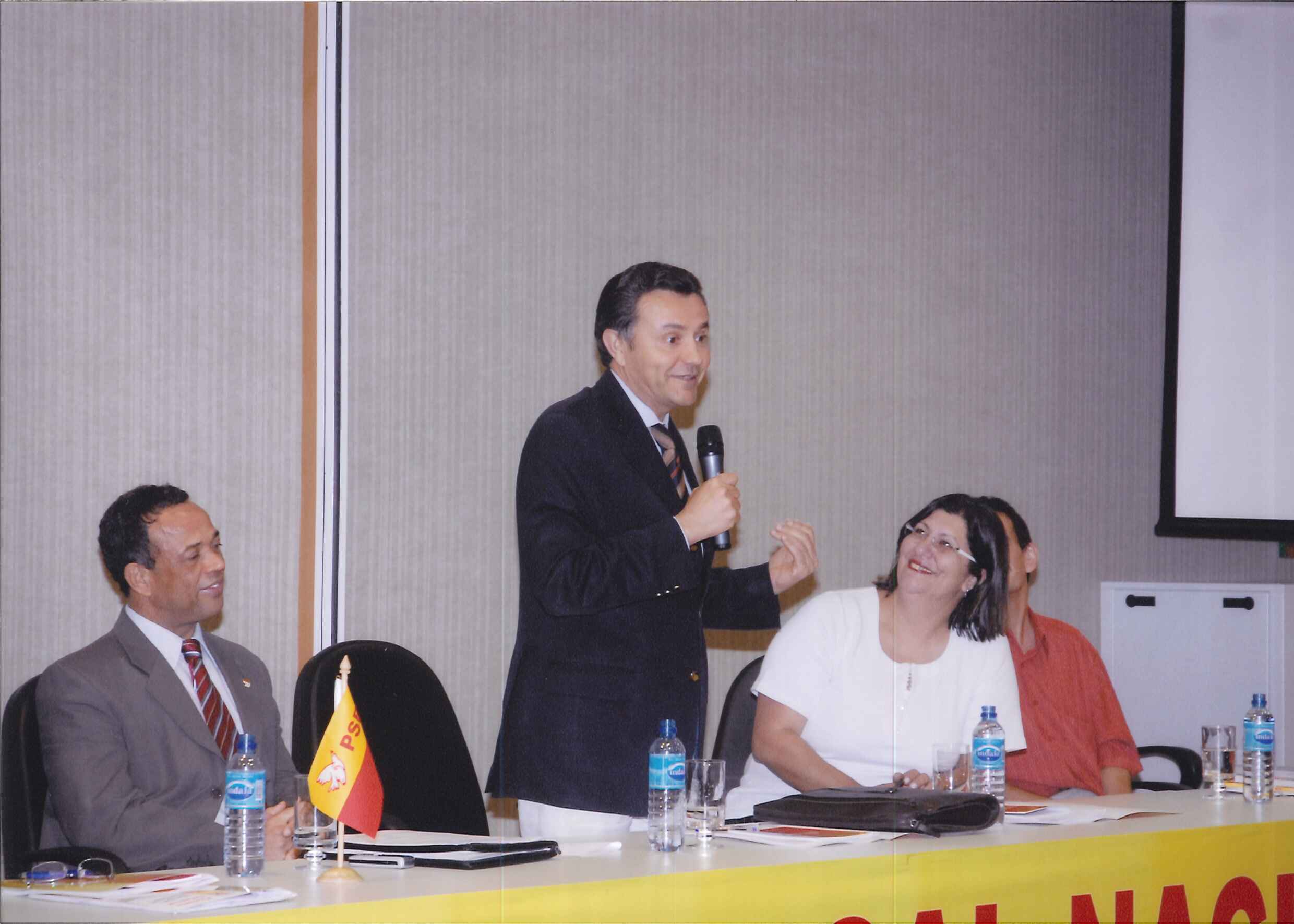 "Carlos Siqueira (ladeado por Joilson Cardoso e Mari Machado), Primeiro Secretário Nacional do PSB, falando no Seminário de Formação Política de Sindicalistas do Partido."