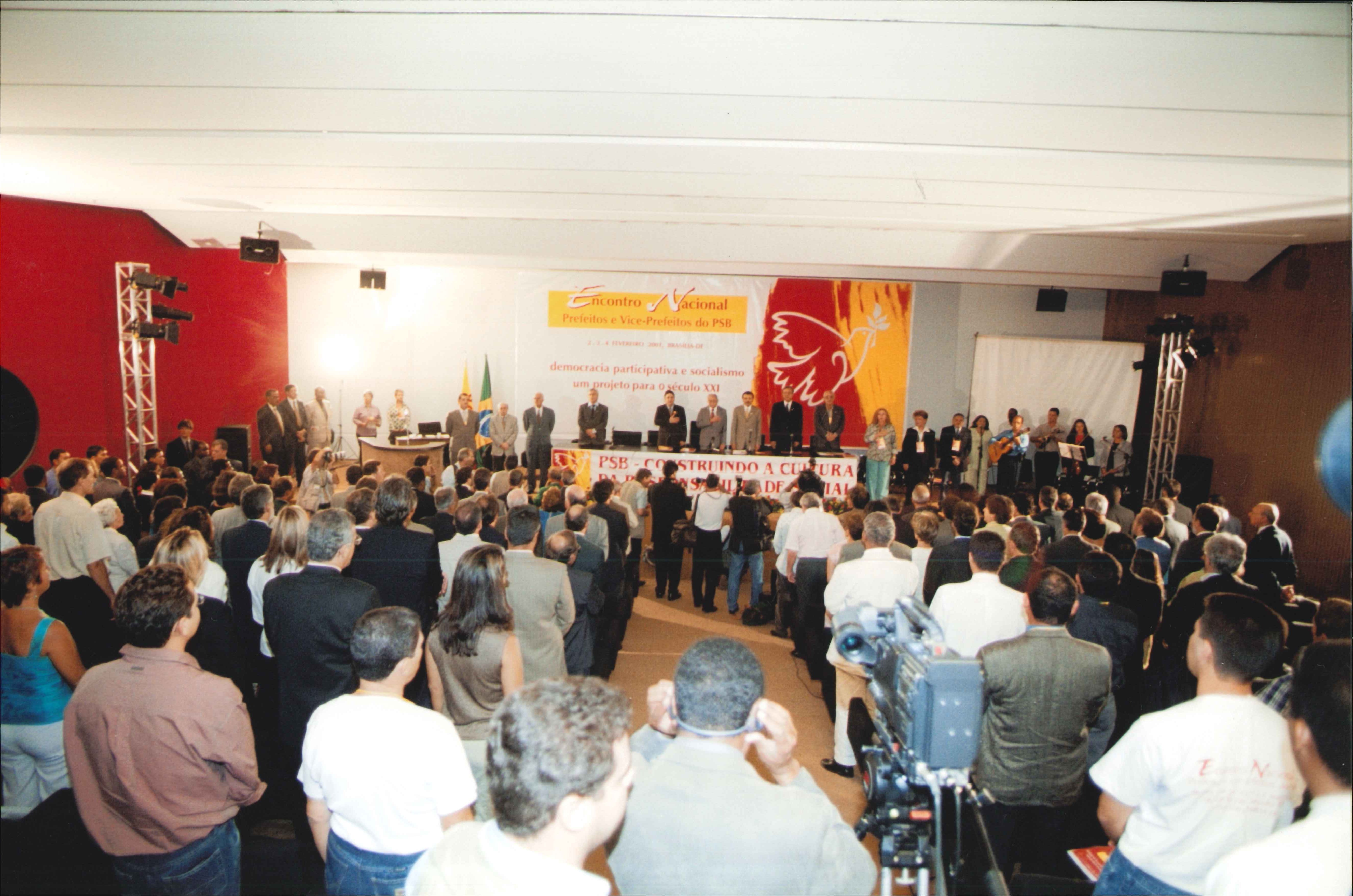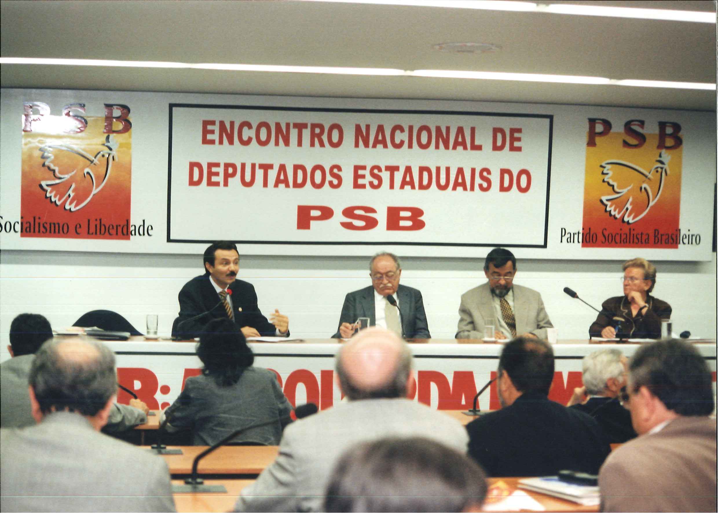"Encontro Nacional de Prefeitos do PSB, realizado na Câmara dos Deputados nos dias 2, 3 e 4 de fevereiro de 2001. Por ocasião da abertura do encontro foi realizada a filiação do Governador do Rio de Janeiro Anthony Garotinho. Na mesa, da esquerda para direita: Márcio França, Roberto Amaral, Saturnino Braga, Alexandre Cardoso, Garotinho, Miguel Arraes, Carlos Siqueira, Ronaldo Lessa, Jamil Haddad, Kátia Born e Wilma de Faria. "