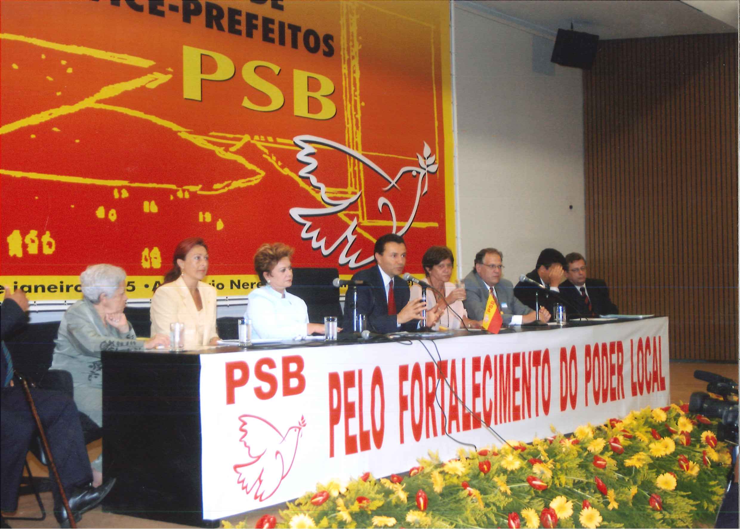 "Mesa temática, experiências de administrações bem sucedidas do PSB, realizada por ocasião do Encontro Nacional de Prefeitos Eleitos em 2004. Da esquerda para a direita: Prefeita Cleusa, Pref. Sandra Silveira, Pref. Wilma de Faria, Primeiro Secretário Carlos Siqueira, Pref. Saudade Braga, Pref. Wander Borges, "